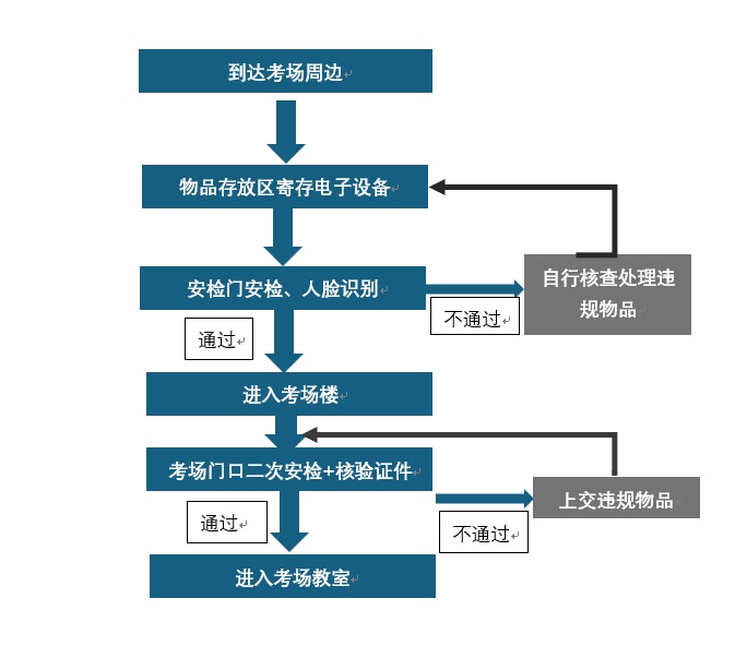②考生自觉遵守秩序,在现场工作人员引导下有序通过智能安检门检查、人脸识别后进入考试楼宇。