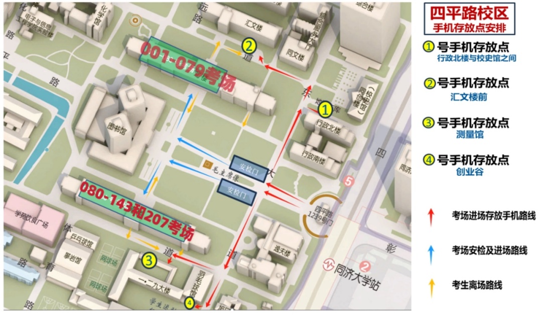 同济大学考点考场分布在:四平路校区教学北楼(考场001-079)、教学南楼(考场080-143,207),四平路校区彰武北大楼(考场144-172),嘉定校区博楼(考场173-206)。