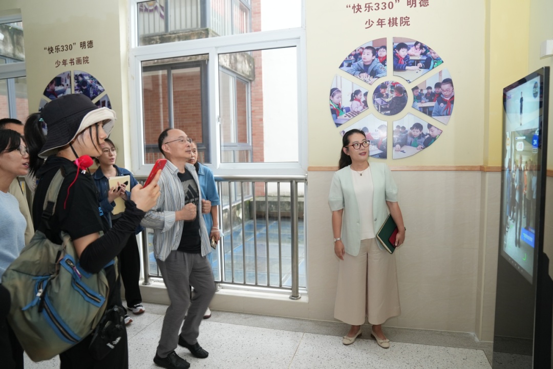奉贤区明德外国语小学于2019年成为上海市教育信息化应用标杆培育校,学校基于“五慧”数质教育、特色“七彩大拇指”综合素养评价体系与新型智慧教学模式的结合应用,借助学生综合素质评价数据平台,生动形象地展示了不同学生的综合能力画像,及由大模型科学诊断得出的因材施教方案。智慧体育课堂借助“运动负荷监测手环”,课前设定负荷目标,课中监督完成情况,课后分析数据效果。智慧书法课堂(“网上艺术厅”)通过智慧书法课堂教学场景观摩,深入了解学校“网上艺术厅”建设——借助VR、AR、MR技术,进行美术、音乐、书法、舞蹈、戏剧等课堂教学,开展系列活动。