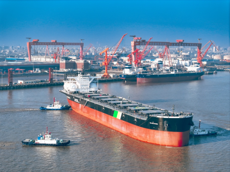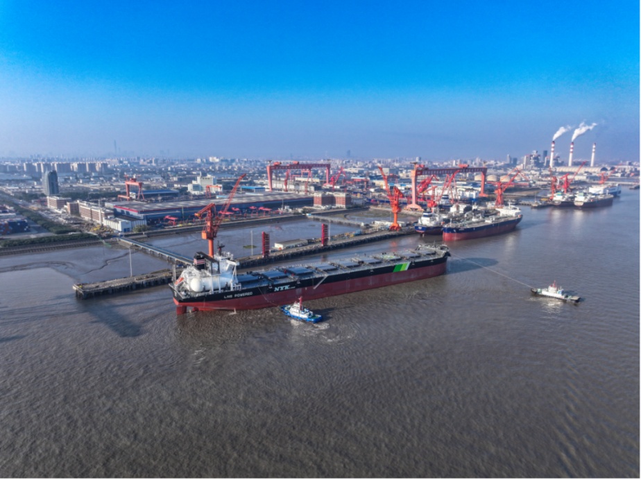 12月17日,中国船舶集团有限公司旗下上海外高桥造船有限公司联合中国船舶工业贸易有限公司为NYK公司建造的18万载重吨液化天然气(LNG)双燃料动力好望角型散货船“海蓝宝石”号启碇鸣笛,缓缓驶离外高桥造船码头,正式投入运营。由此,外高桥造船以超产2艘商品船的佳绩,为2024年画上了一个圆满的句号,也标志着该公司超额完成全年生产经营任务,即将昂首跨入2025年。