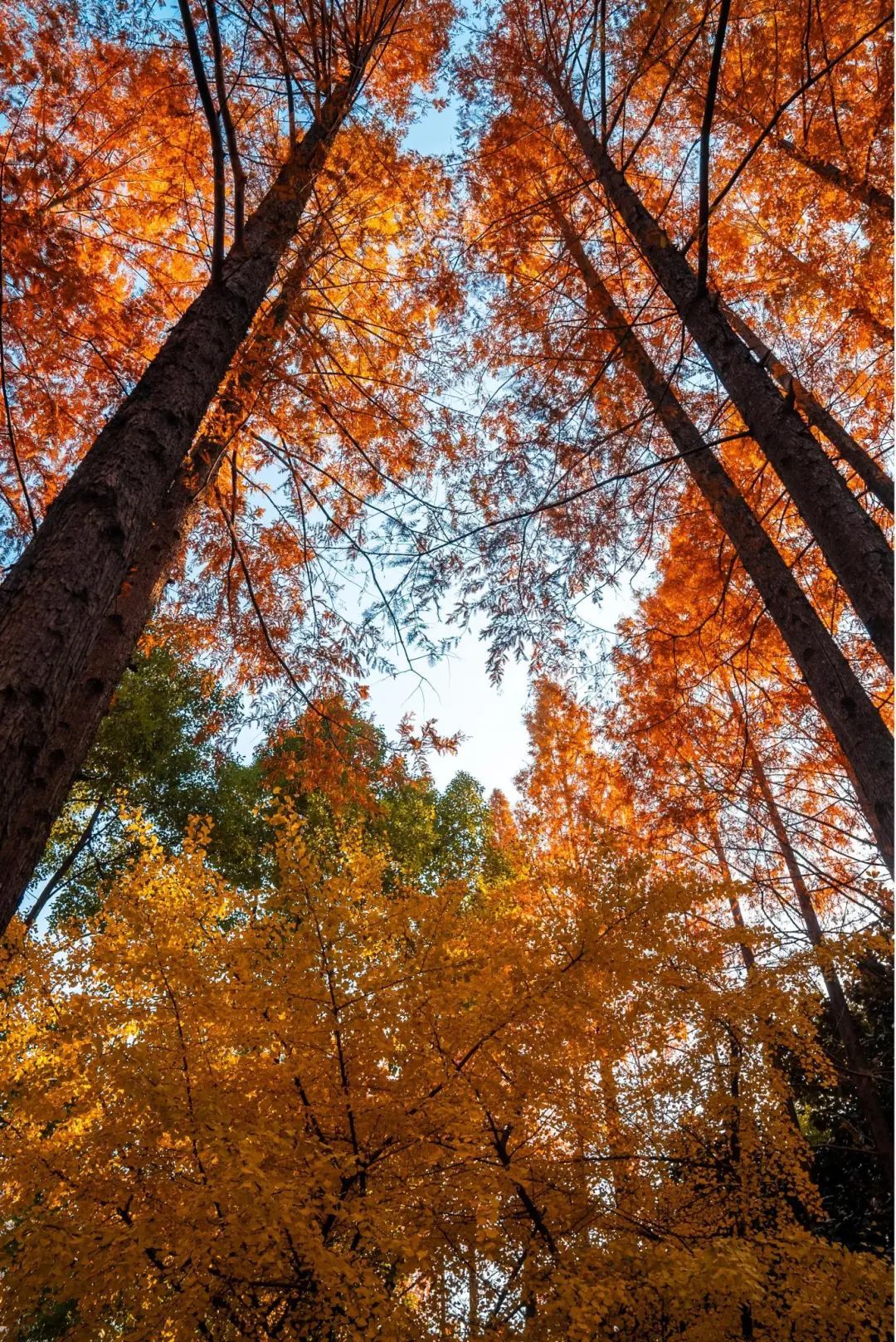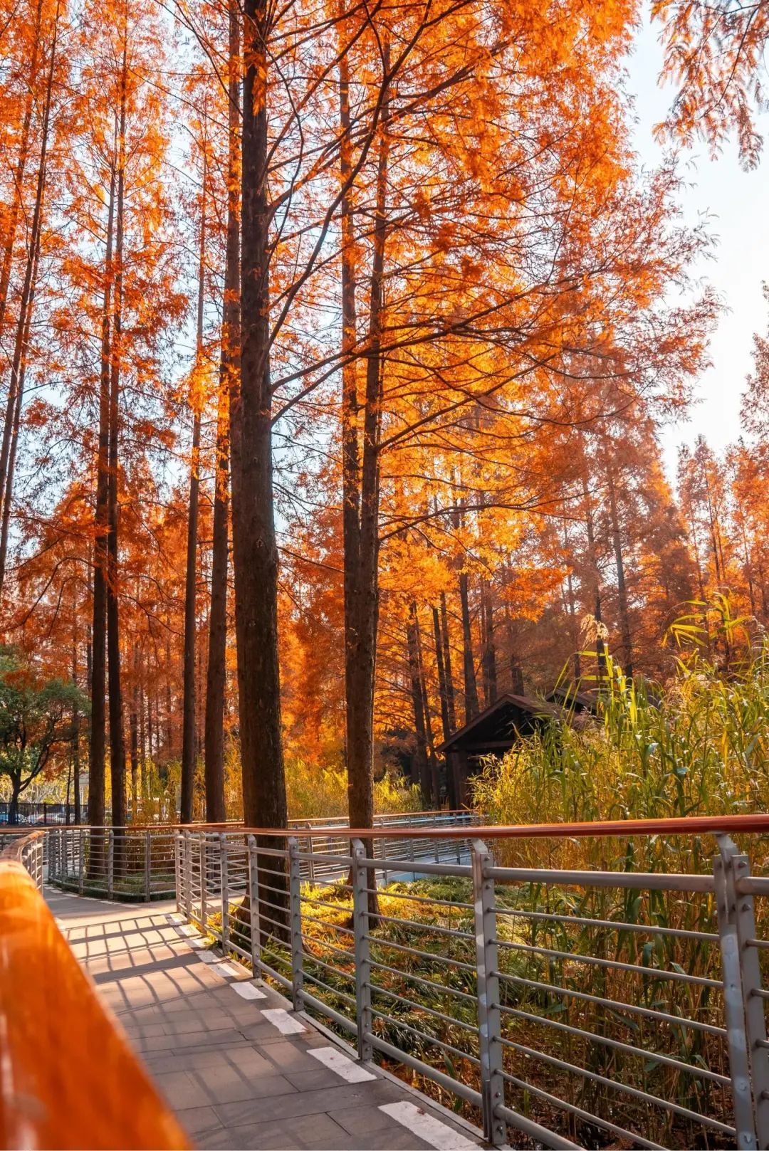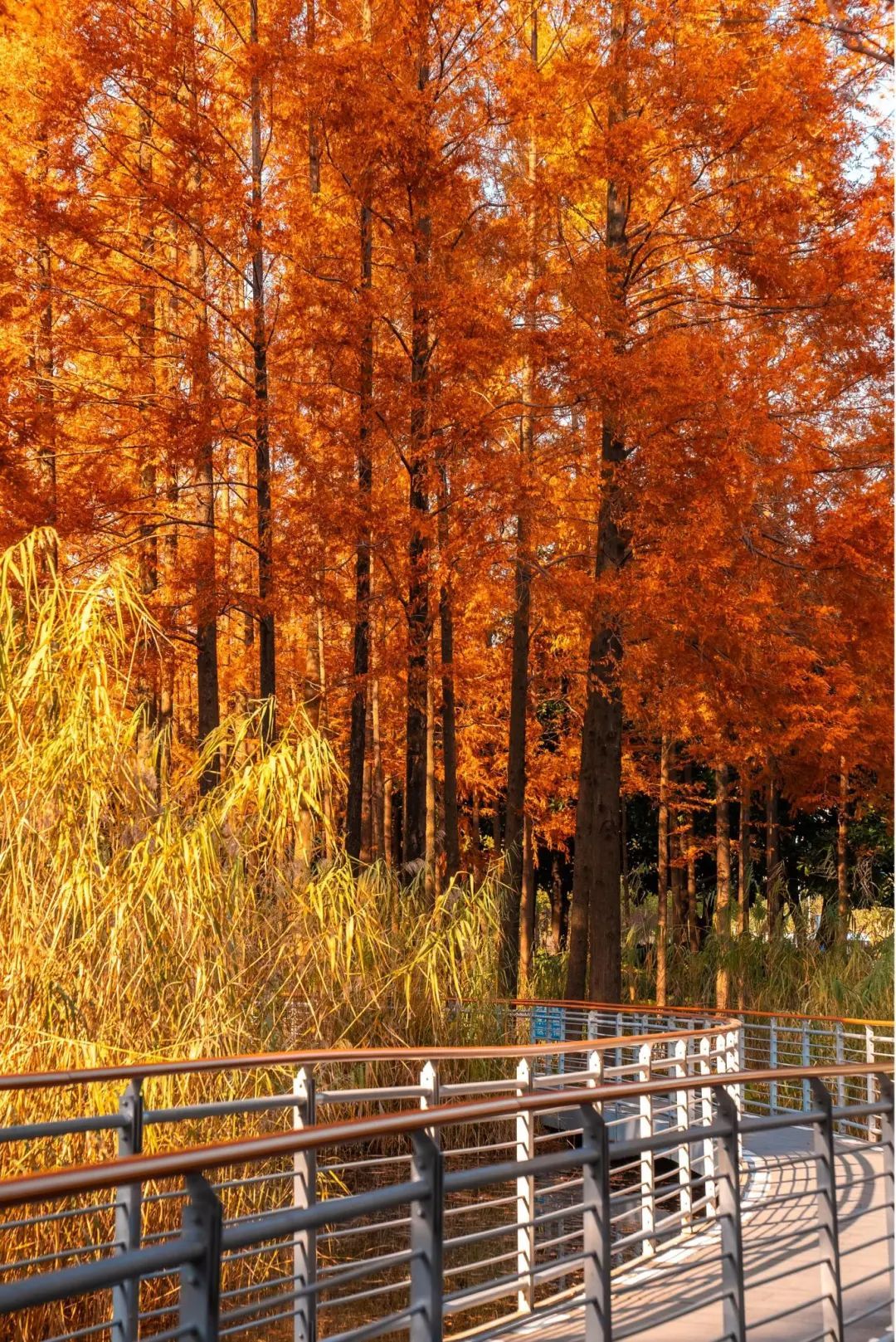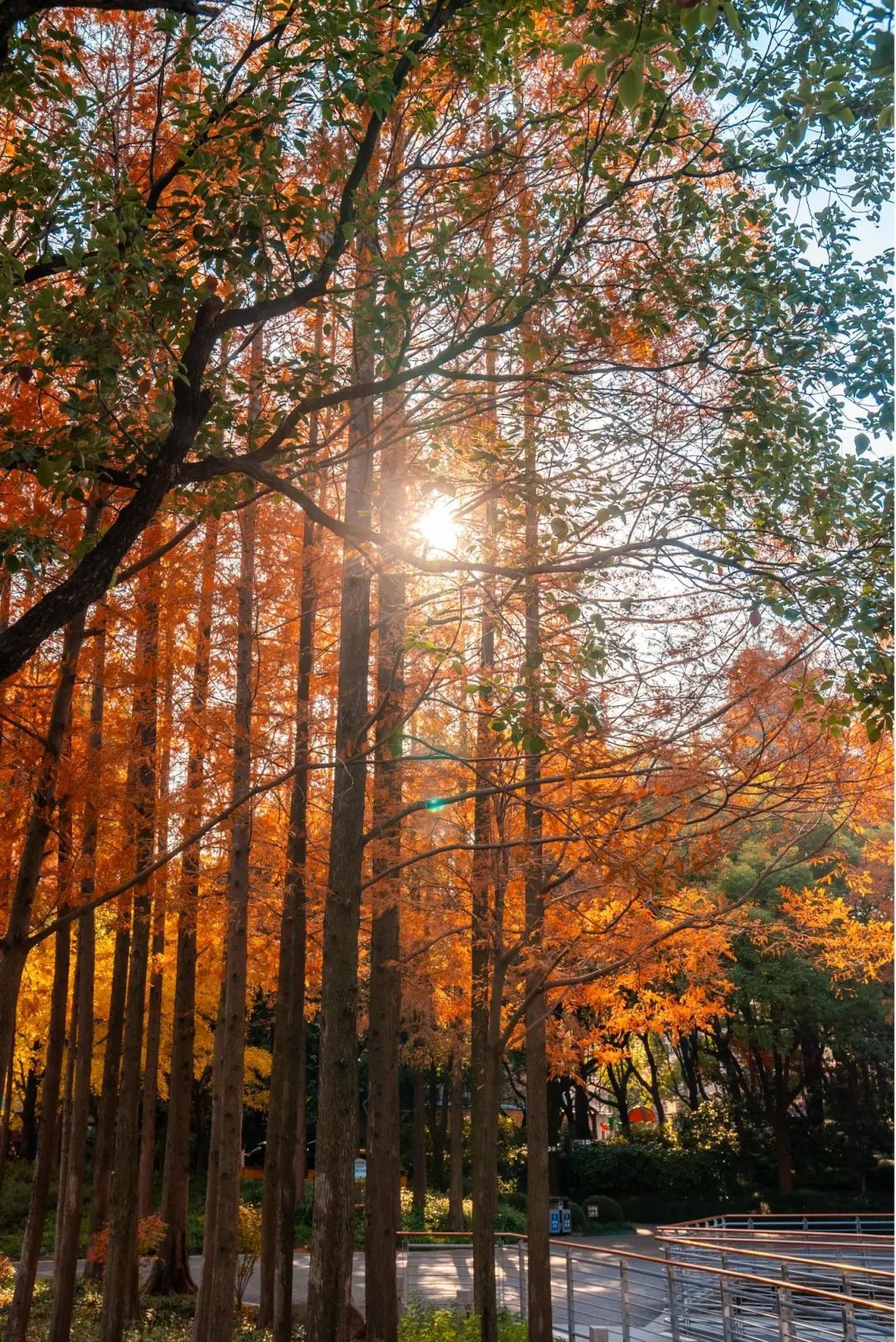 水杉在暖阳照耀下色彩艳丽