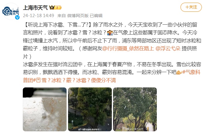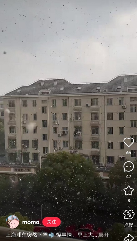 冰雹多发生在强对流云团中,在上海属于春夏产物,不易在冬季出现。雪也比较容易识别,飘飘洒洒下得慢。而冰粒、霰则容易混淆。
