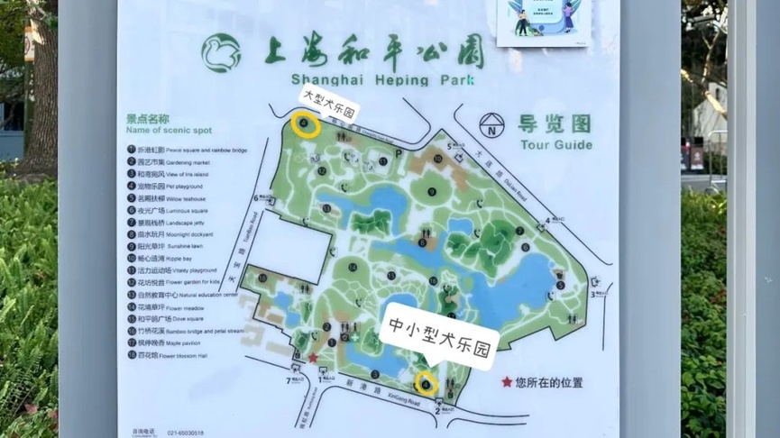 我是中型犬,所以“爸爸”帮我预约了位于和平公园2号门边上的新港路萌宠狗乐园。如果是肩高≥45cm的大型犬,需要你的“爸爸妈妈”帮你预约天宝路畅心园路口和平公园6号门旁的天宝路萌宠狗乐园。入口处设置有狗狗肩高表,“爸爸妈妈”可以根据狗狗的体型标准选择区域。