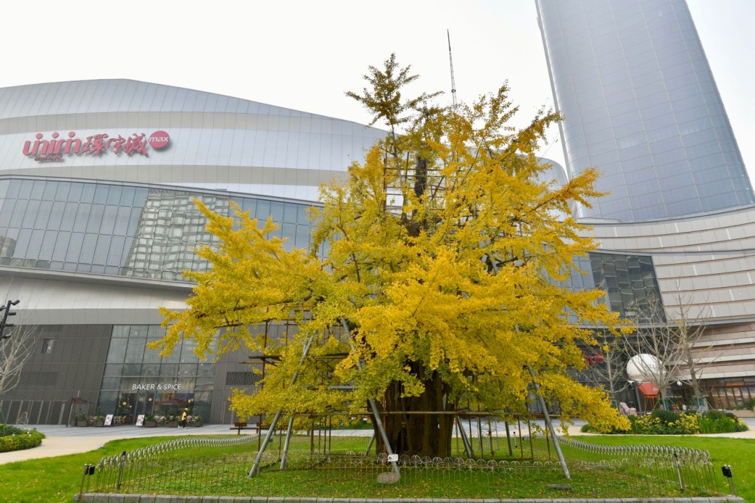 为了保护城市不可再生的宝贵资源,经多方论证,最后选择了“道路让位古树”的方案,让古树能够在原有生境下更好地生长。如今,在曹安路高架之南,万镇路车道之间,为这株古银杏打造了一座面积达730平方米的“绿岛”。在绿岛里设置了保护围栏,配置了绿化植物,让这棵古银杏成为浓缩城市记忆的新坐标,微风轻拂,那金黄色的“小扇子”或在枝头飘摇、或与泥土相拥,用一抹绚烂的金黄,将景色渲染到了极致。
