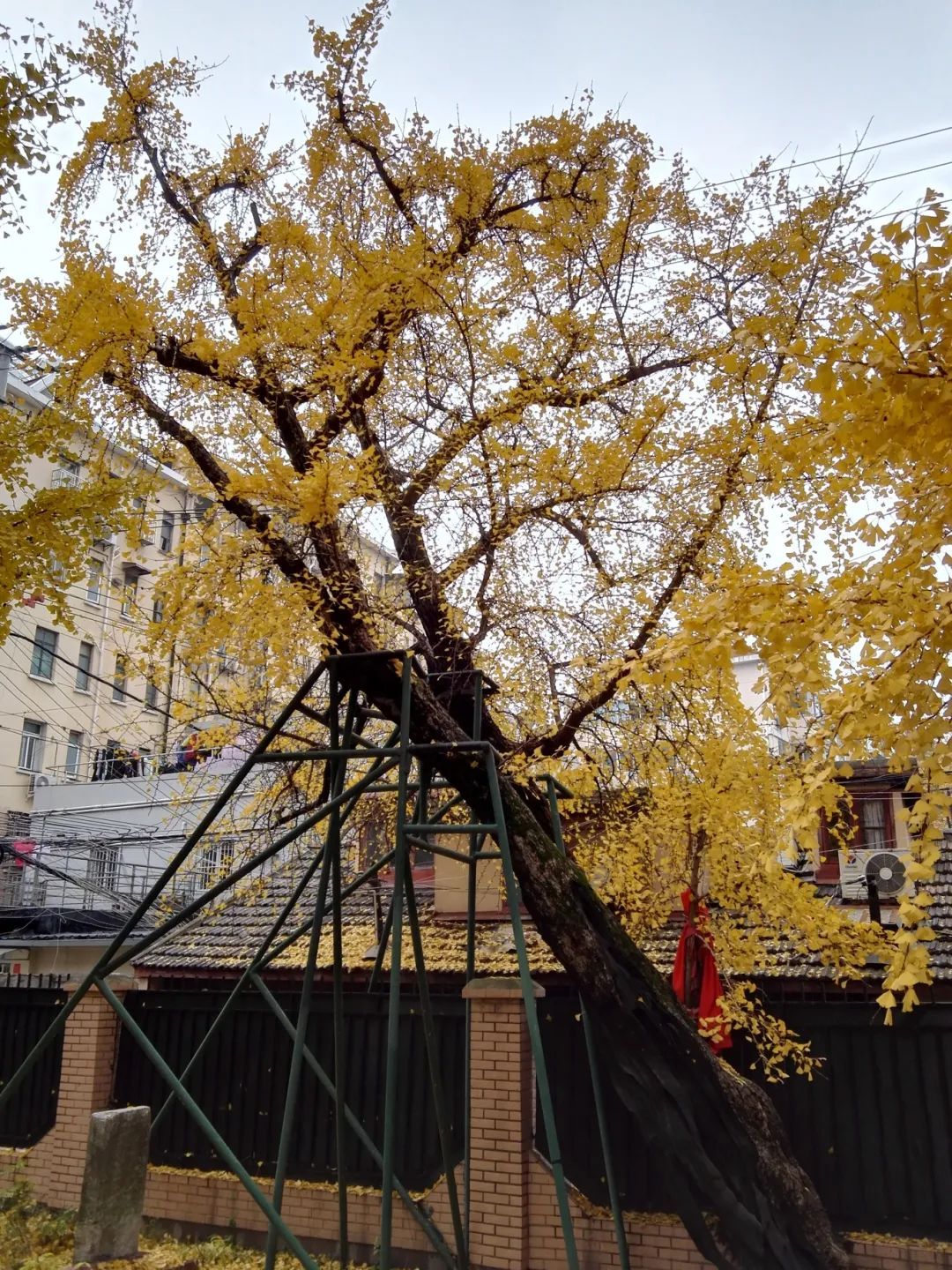 700多岁的古银杏树见证了上海百年来的沉浮,镶刻着的文明印记,它是活着的“文物”。它缓缓褪去绿意,披上一袭璀璨的金黄外衣,再展芳华。风中摇曳时,银杏叶飘洒,很是养眼,仿佛在诉说着它们的生命故事。由于树干长势歪斜,市、区古树管理部门还为其量身定制了“拐杖”,让他“安享晚年”。