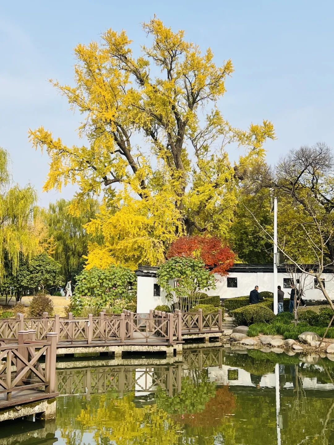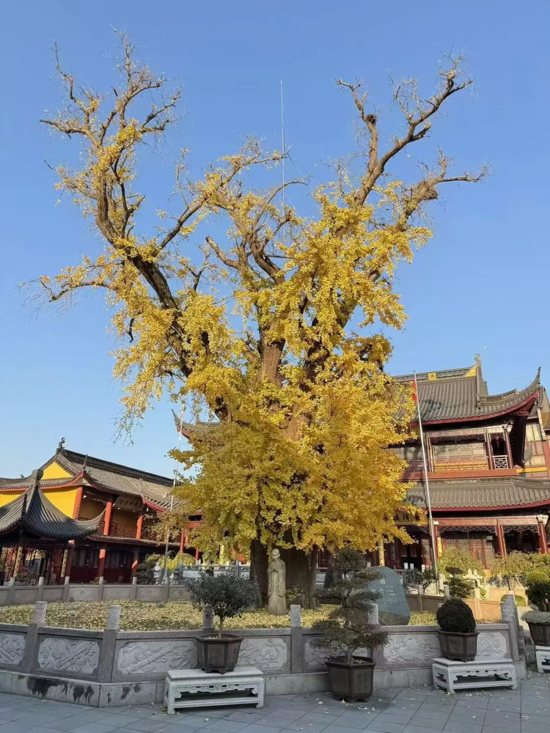 高耸云天的古树与巍峨的报国寺融为一体,为古老的寺庙更添辉煌。如今,金黄的叶片在阳光下闪烁,仿佛在为游客们讲述着古老的故事。淀山湖畔的这位“植物界活化石”,以最动人的姿态将初冬的诗意镌刻在每一片舞动的叶片上,为古刹更添几分禅意与静谧。