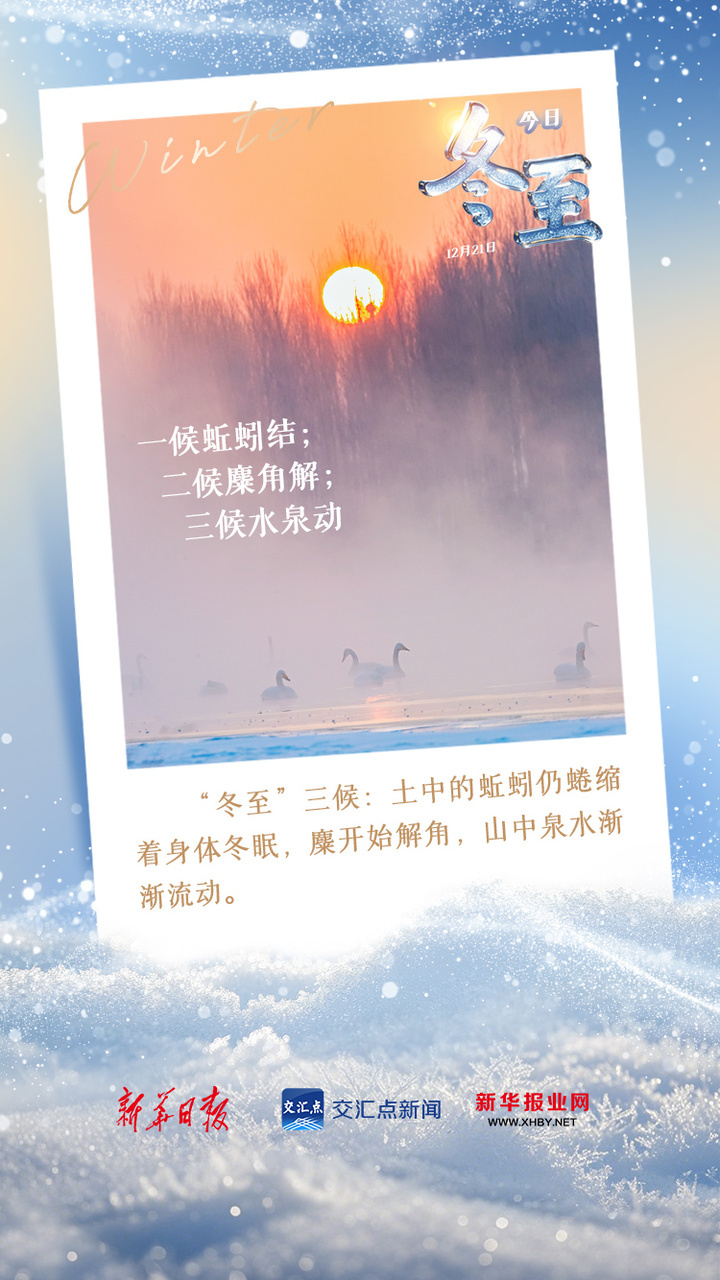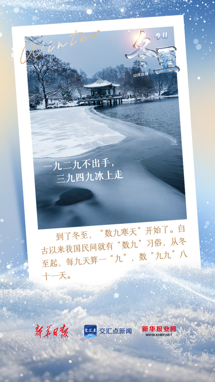冬至这天,太阳直射南回归线,北半球昼最短夜最长。我们的祖先也总是从这一天开始“数九”,记录冬至到来年春分的物候变化。“数九”数的是希望,心中装着对春的期盼,不疾不徐,日日数到暖,静候春日来。