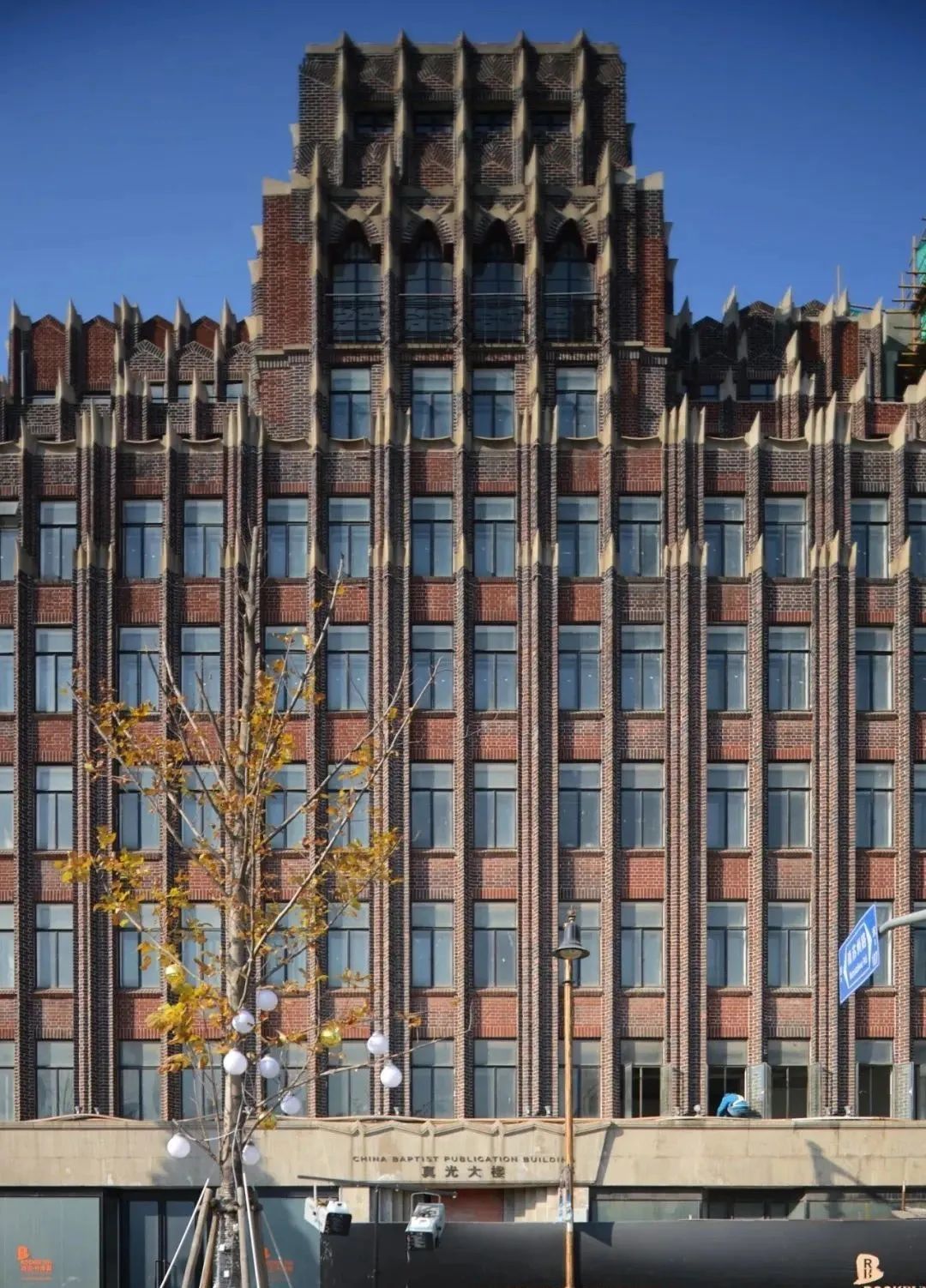 广学大楼呈现装饰艺术派风格及部分哥特复兴风格特征,由邬达克设计。坐东朝西,九层钢筋混凝土结构,整幢建筑的立面为锐角状线条装饰,出女儿墙收头,大片玻璃窗与凸出的墙体凹凸相间,使立面充满变化,外墙为褐色泰山砖饰面;入口西立面作贯通立面的巨大尖券造型,气势恢宏,其深褐色面砖和竖线条处理,层层收进的顶部造型,反映出当时流行的美国装饰艺术风格的摩天楼的特色。如今,广学大楼作为一处重要的文化地标,经常举办各类文化展览与学术交流活动,为公众提供了丰富的文化体验和学习机会。