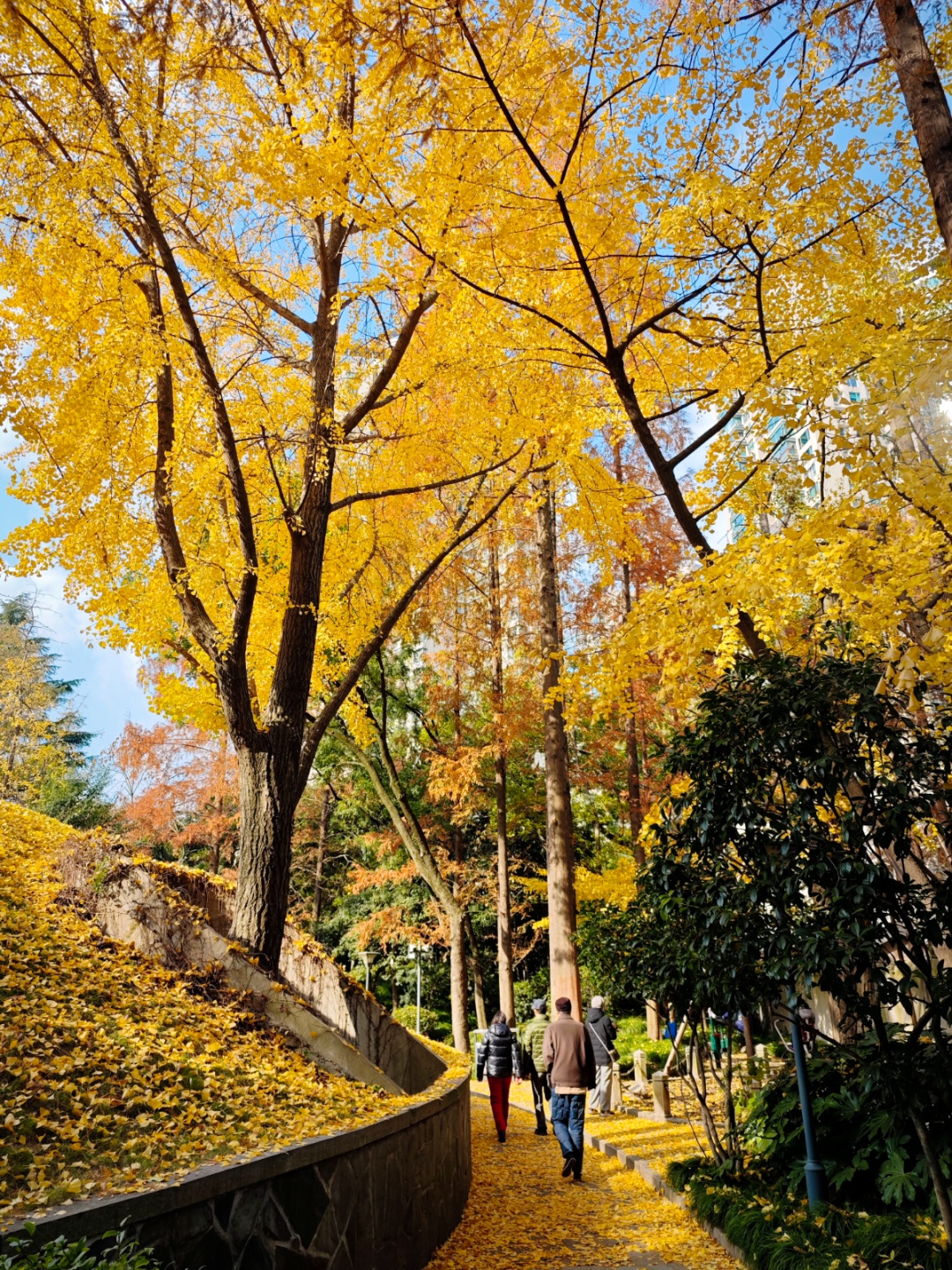 距离徐家汇天主堂东北角的圣爱广场前,三株已经150岁的古银杏成线型排列,与教堂绿地遥相呼应,构成了徐汇区内最大的古银杏群,整个广场被银杏叶染成一片金色,吸引了不少市民游客前来观赏拍照。相传这些银杏是由法国耶稣会传教士种植在此,为广场增添了别样的景致。