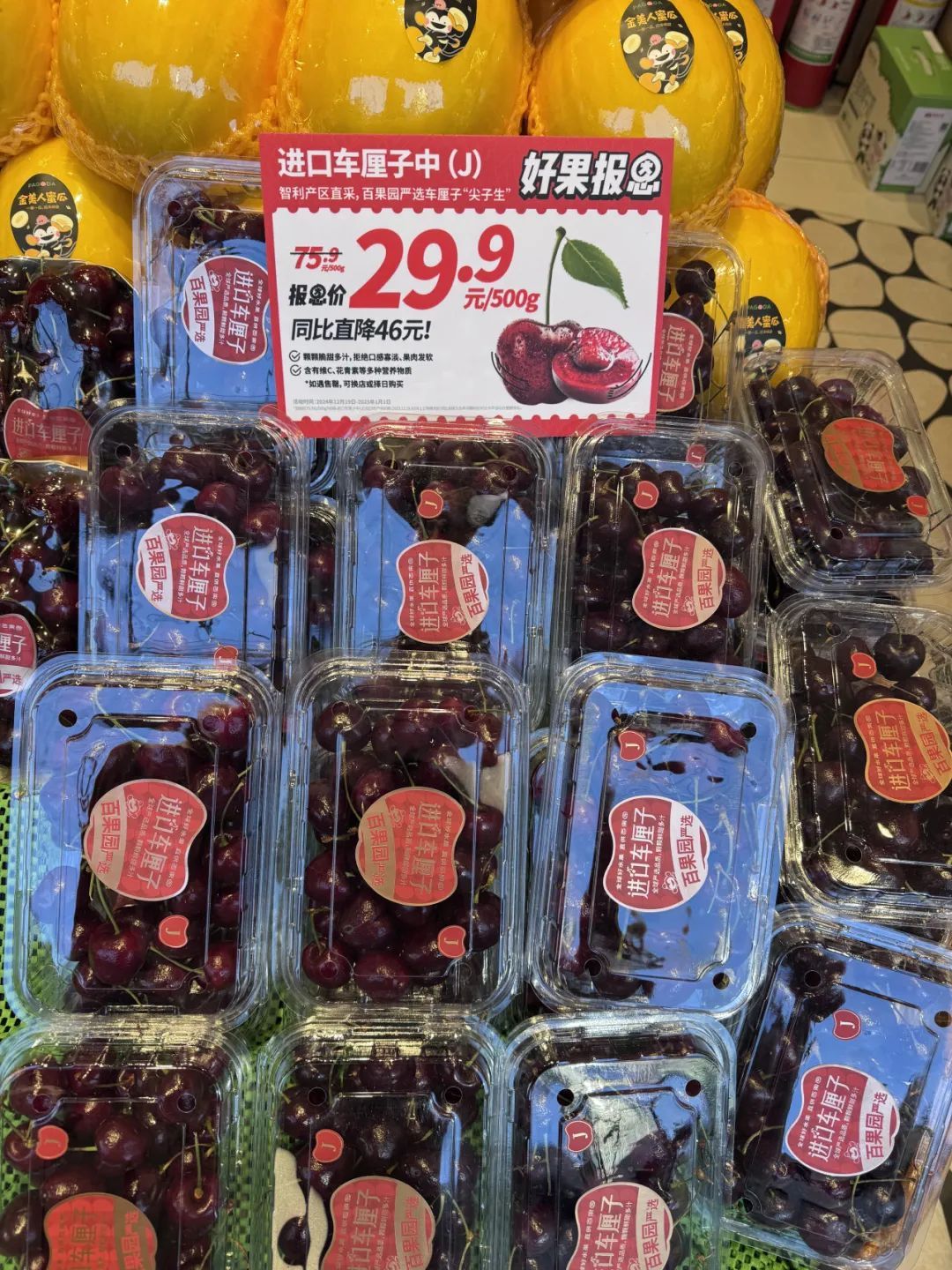 “最近买JJJ级别车厘子的顾客增加了不少。促销前,JJJ级别车厘子价格为129元每斤,活动优惠价是99.9元每斤。”