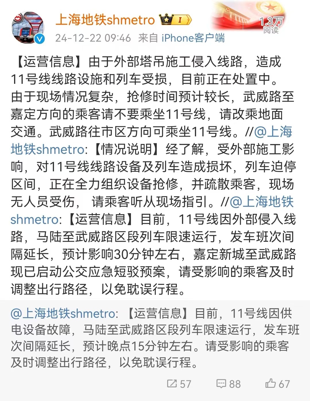 由于外部塔吊施工侵入线路,造成11号线线路设施和列车受损,目前正在处置中。由于现场情况复杂,抢修时间预计较长,武威路至嘉定方向的乘客请不要乘坐11号线,请改乘地面交通。武威路往市区方向可乘坐11号线。点对点公交保障方案出炉,详情如下↓