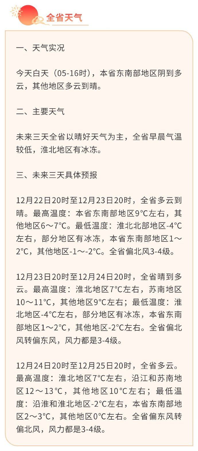 22日20时到23日20时,全省多云到晴。最高温度:本省东南部地区9℃左右,其他地区6~7℃。最低温度:淮北北部地区-4℃左右,部分地区有冰冻,本省东南部地区1~2℃,其他地区-1~-2℃。全省偏北风3-4级。