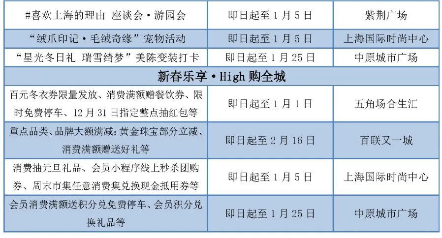 跨年迎新购物季期间,杨浦区各大商业综合体、特色商业街区推出精彩纷呈的年味主题活动,同时牵手众多品牌商家为消费者献上特别礼遇,一起期待吧!