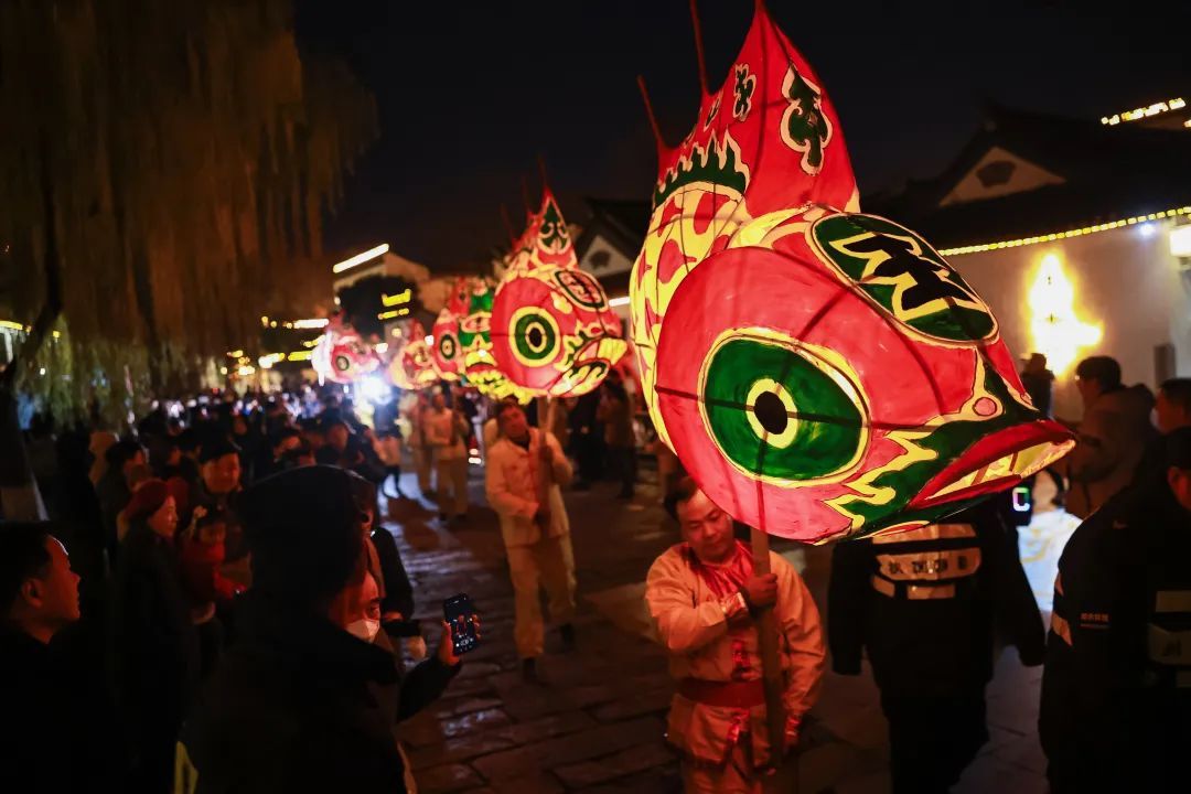 游客们纷纷驻足观赏,无不被这眼前的景象所震撼。吴女士特地从市区赶来,她告诉记者:“我之前只在电视上看到过这种非遗鱼灯,今天亲眼看到它们在州桥老街上游走,感觉像是穿越到了古时候。这种将传统文化与老街完美融合的场景,既有烟火气,又格外喜庆。”