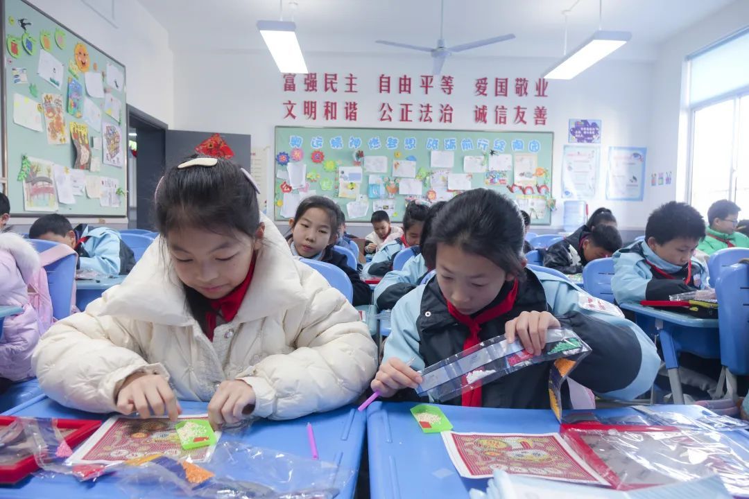 在“五育润心,赋能成长”迎新劳动实践活动中,徐汇区东二小学各年级的“小陶子”们纷纷化身小小艺术家。一年级专注于毛球作画;二年级让传统的剪纸窗花跃然纸上;三年级用不织布作出喜庆的鞭炮、小鱼、福袋等挂饰;四年级用竹条编制出承载新年美好期许的竹编画;五年级将微小钻石贴在画布上,以生肖蛇年、年年有鱼、新春快乐等为主题的作品,在钻石的点缀下熠熠生辉……