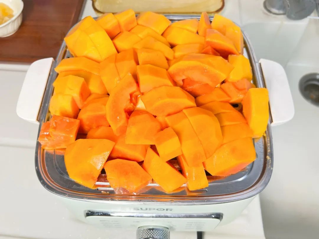 1.一颗木瓜(1千克左右)去皮切块,上锅蒸10分钟;