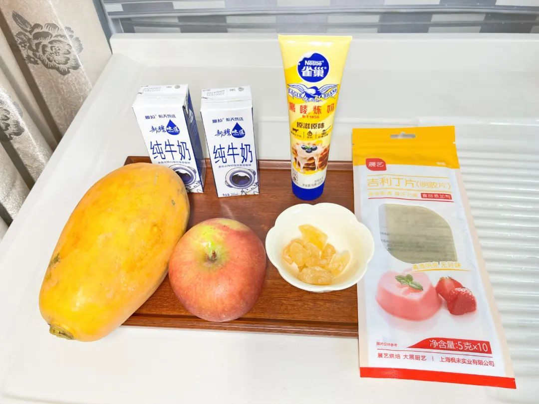 食材:木瓜,牛奶,冰糖,炼乳,吉利丁片