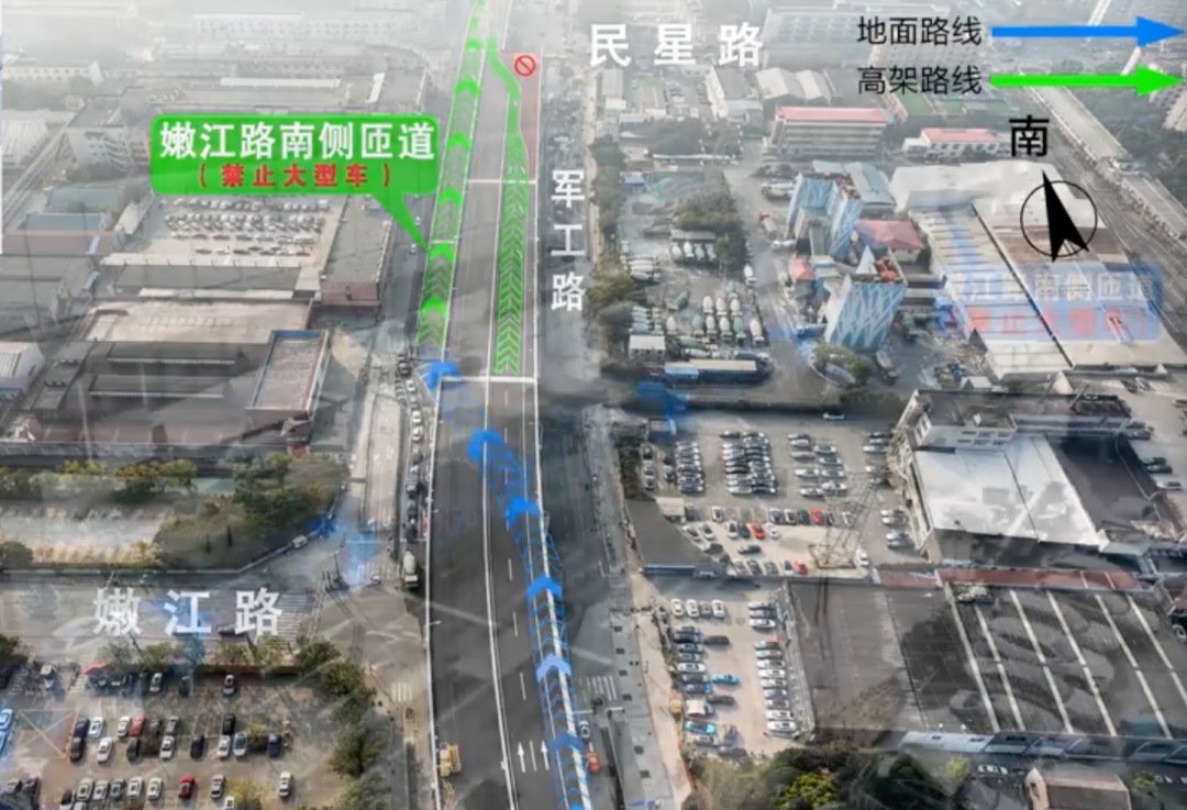 嫩江路南侧匝道未来规划为军工路高架的下匝道,在施工期间临时开放作为上匝道使用,因此宝山方向(北向南)的地面来车需在军工路/嫩江路路口逆向进入嫩江路南侧匝道;