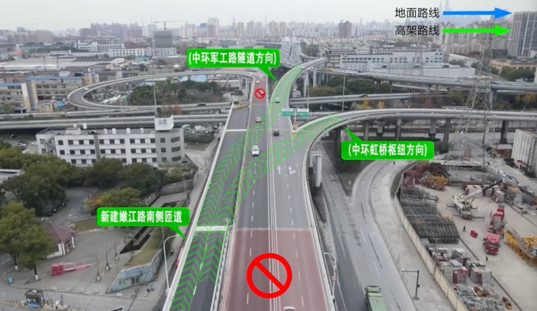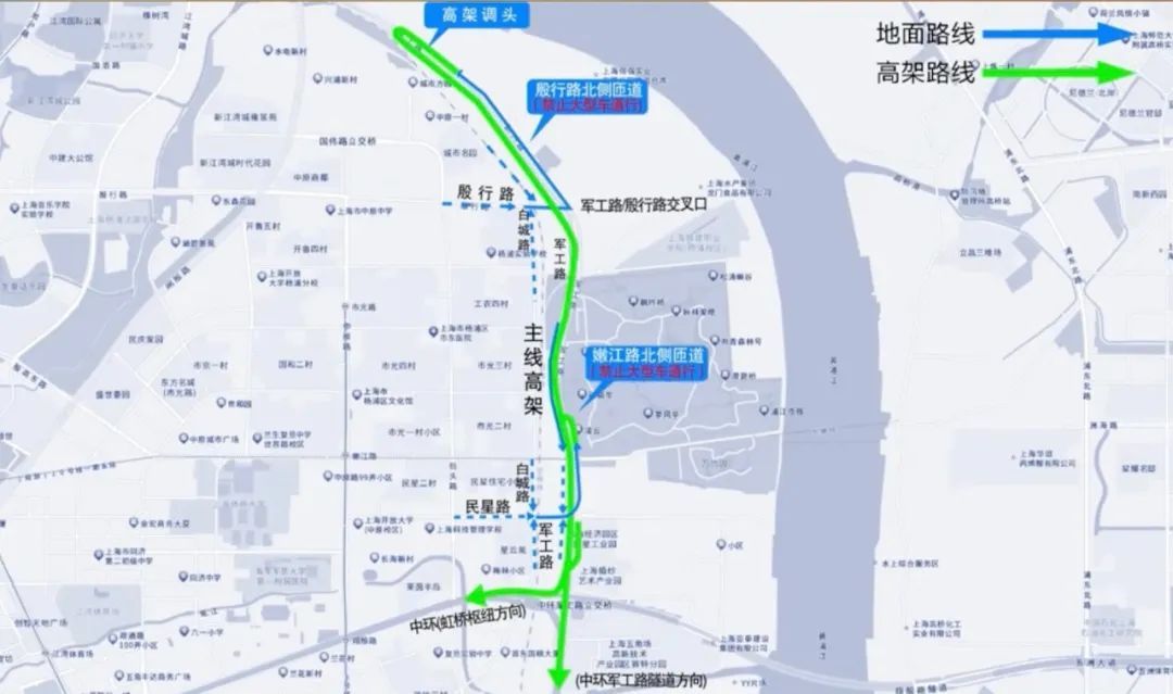施工期间,临时开放军工路高架部分主线道路作为上中环保通线路,该地区三处匝道可上高架通往中环。