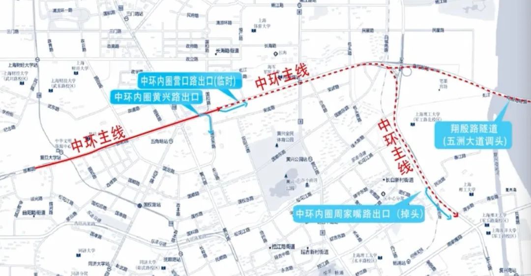 中环内圈可从国定路、黄兴路、周家嘴路及临时增设的营口路出口匝道等道路进行分流绕行。