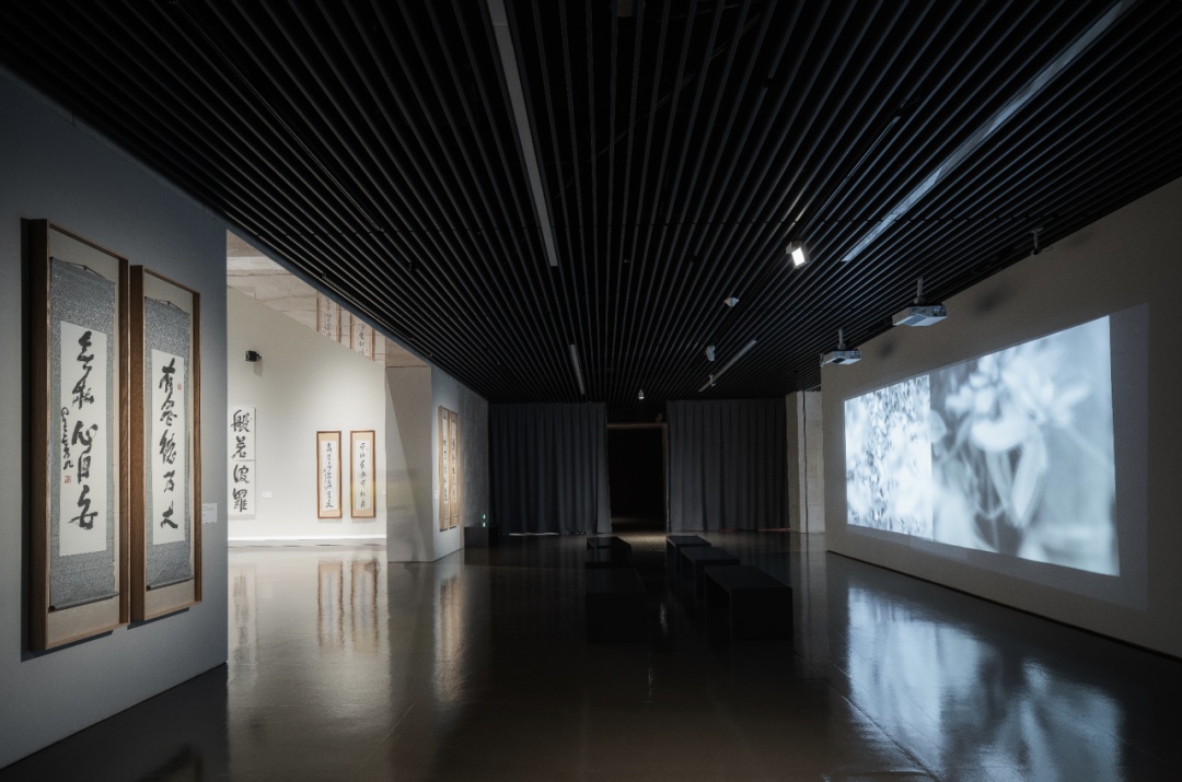 “明镜亦台亦非台”展区的进入式影像空间作为展览一大亮点,从各类大师日常书法记录影像剪辑而来的短片,经由多面镜子的来回折射,呈现出万花筒般的视觉体验。通过多媒体沉浸式空间播出的全新星云大师一笔字故事沉浸式影片,亦令观众在此“坐看云起”,了解星云大师风起云涌、而又宠辱不惊、去留无意的一生。