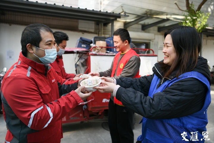 1月6日,常州市钟楼区五星街道花园新村第二社区党员志愿者化身“爱的快递员”,为在社区送快递的“小哥”送上腊八粥和保暖头盔,速递温暖平安和节日的祝福。史康摄 视觉江苏网供图