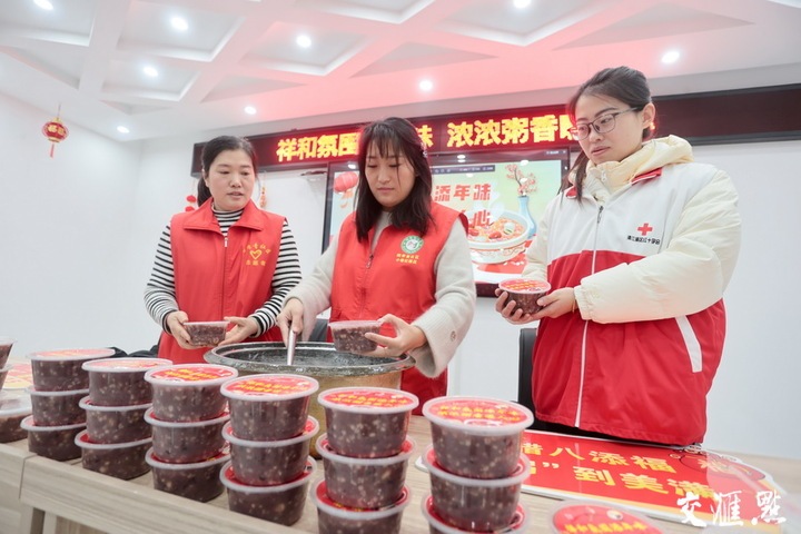 1月6日,淮安市清江浦区清浦街道四季青社区新时代文明实践站开展“祥和氛围添年味 浓浓粥香暖人心”活动。志愿者将腊八粥打包装好,送给辖区独居老人、环卫工等,提前感受浓浓年味。王昊 潘强摄 视觉江苏网供图