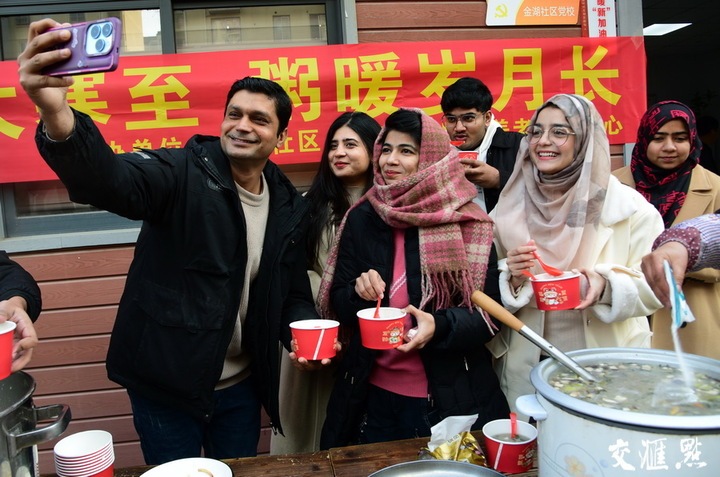 1月5日,江苏大学留学生走进镇江市和平路街道金湖社区,与居民一起熬制腊八粥,了解腊八节习俗,感受中国传统民俗文化。石玉成 陈佳楠摄 视觉江苏网供图
