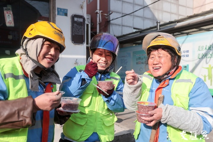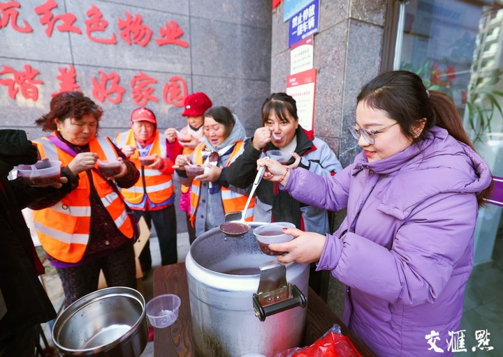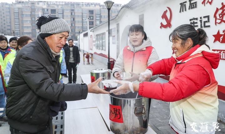 1月6日,沭阳县沭城街道新桥社区开展“飘香腊八粥 温暖邻里情”迎腊八节主题活动,现场熬制了几大锅香喷喷的腊八粥。志愿者们还将腊八粥送到小区居民、环卫工人和一些特殊群体手中,让他们在寒冬中感受到真情和温暖。周阳 摄 视觉江苏网供图