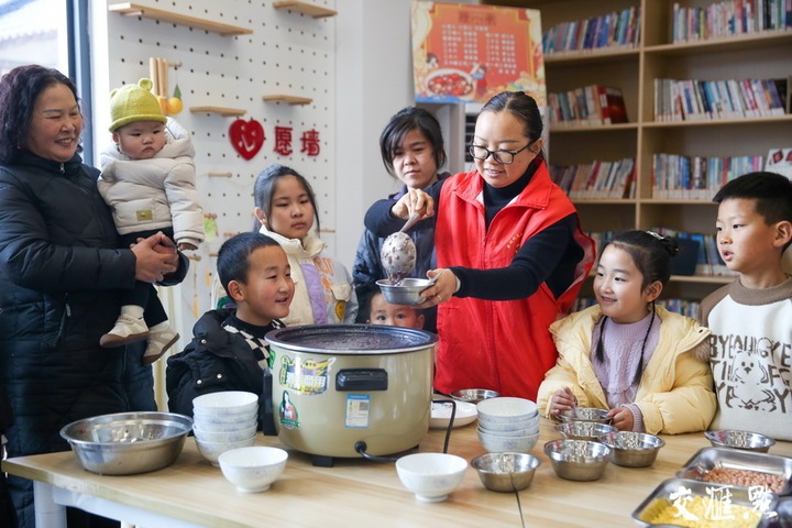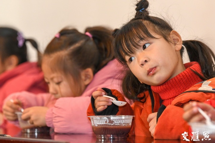1月5日,如皋市城南街道新时代文明实践所在肖陆村农家书屋开展“温暖过小寒 民俗迎腊八”主题活动,孩子们辨识腊八粥食材、喝碗暖暖的腊八粥,了解传统民俗。徐慧摄 视觉江苏网供图