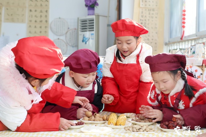 1月6日,无锡市阳山中心幼儿园的孩子在老师指导下,了解腊八习俗,体验传统民俗。还月亮摄 视觉江苏网供图