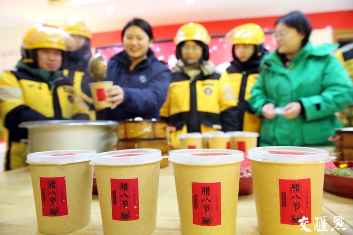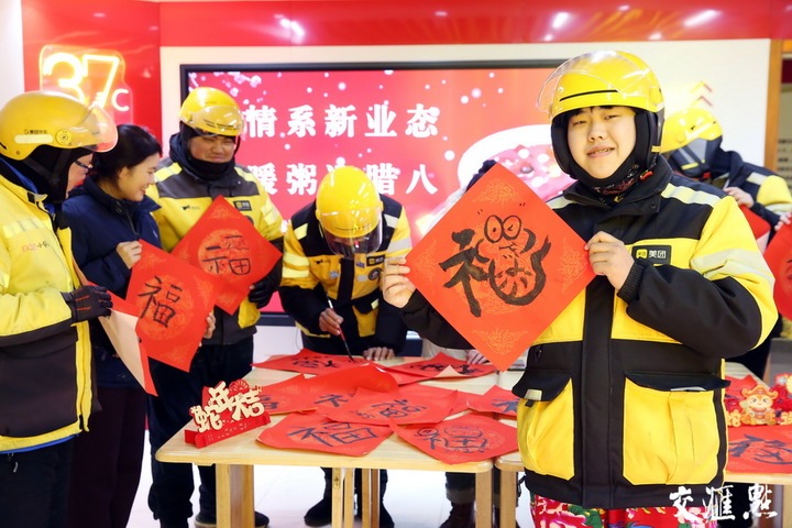 1月6日,连云港市连云区墟沟街道东园社区邀请辖区内的外卖骑手、快递员,通过书写创意“福”字、喝腊八粥、赠送御寒物品等方式,让他们感受来自社区大家庭的温暖。朱华南 顾笑摄 视觉江苏网供图