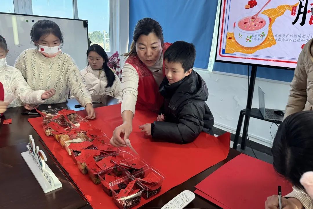 志愿者向孩子们介绍腊八粥的传统文化背景,并请孩子们写下现场的腊八粥食材。