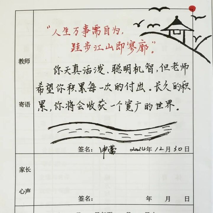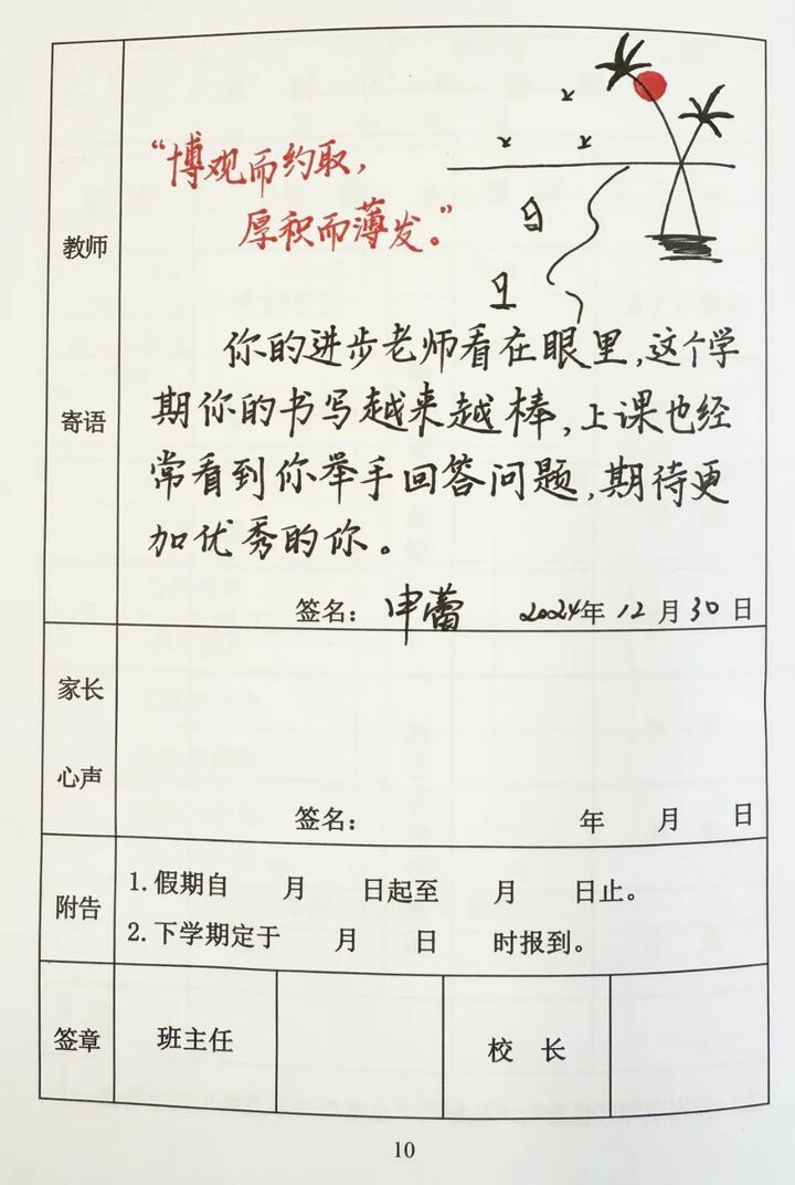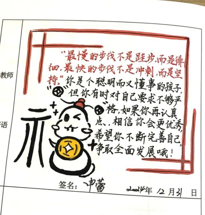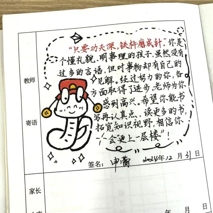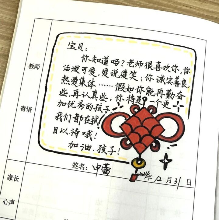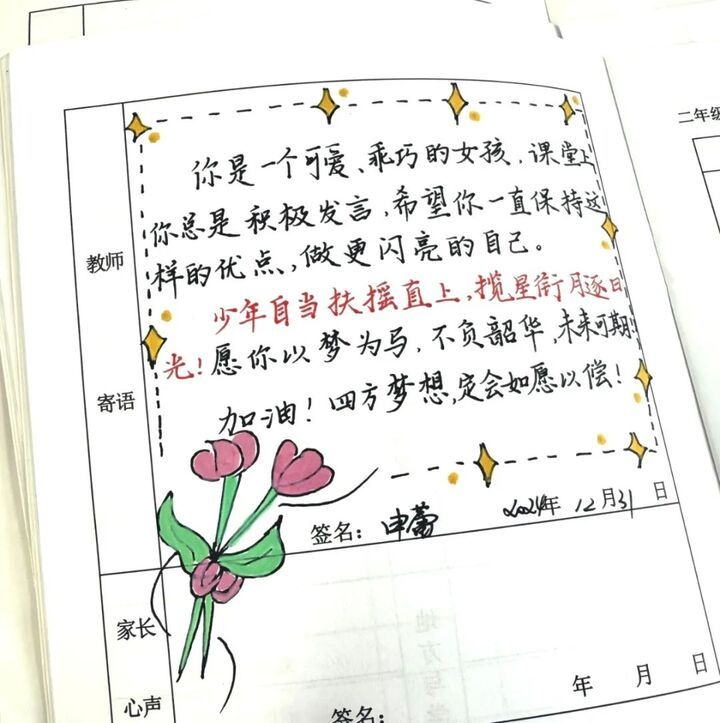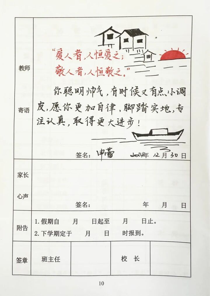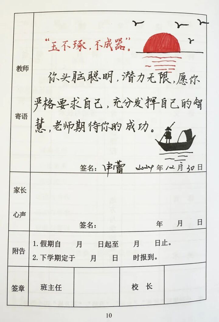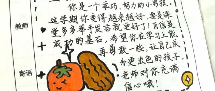 小小的一页纸,满满的成长感动。短短的几行字,暖暖的师生情谊。每一份评语都是她对孩子深入了解后,用心写下的鼓励话语,也是送给学生的贴心“礼物”。
