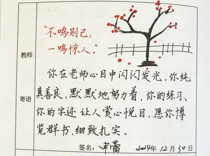 在如皋市长江镇永平小学,有这样一位“宝藏”老师。给孩子写期末评语时,申蕾用上了自己的“十八般武艺”:诗词、绘画……每一样都是孩子们的专属礼物。她用细心、耐心和爱心,表达对学生的鼓励和关爱:“春种一粒粟,秋收万颗子”“不鸣则已,一鸣惊人”。