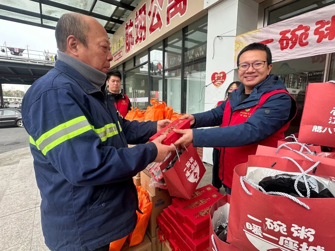 今天上午,松江经开区中部园区街区党支部携手园区内的餐饮企业“老阿爸”在松卫北路313弄园区开展“浓情腊八”活动,为园区内的一线环卫工人送上冬日温暖。