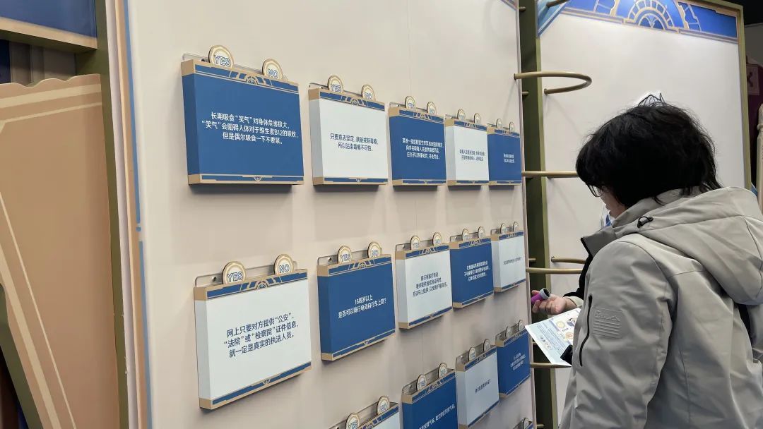 活动现场设置了主题互动、主题打卡点、主题宣讲、主题周边派送等多个体验区,寓教于乐、宣防入心。进场时,工作人员会给每位“探员”发放一份《探员引导手册》。各位“探员”领取后可依次开展各类挑战,最多可收集五枚印章用于兑换本次活动主题的周边礼品。在“穿越反诈区”,“探员”需记住道路两侧展示的各种诈骗类型,在区域出口处抽取案例,答出对应的诈骗类型。回答正确后,工作人员将为其发放一枚海洋球。“探员”将海洋球投入美露莘热气球框内,则挑战成功,可获得一枚印章。此外,现场还有反应力测试、安全知识问答和合照装置打卡等互动小游戏。