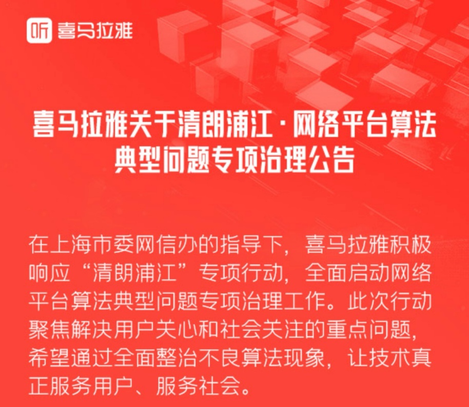 2024年11月以来,根据中央网信办等四部门联合部署,上海市委网信办会同市通管局、市公安局、市市场监管局推进开展“清朗浦江·网络平台算法典型问题治理”专项行动,要求上海属地网站平台针对“信息茧房”、操纵榜单炒作热点、侵害新就业形态劳动者权益、大数据“杀熟”、算法向上向善服务缺失等重点问题开展自查自纠。 近日,在上海市委网信办指导下,小红书、得物、喜马拉雅、哔哩哔哩、拼多多、饿了么、大众点评、携程、SOUL、叮咚买菜、星野、跃问等网站平台陆续发布了“清朗浦江·网络平台算法典型问题治理”专项行动治理公告,并公布网民投诉举报反馈渠道,表态主动接受社会监督,将根据网民反映的问题调整优化算法应用,促进算法应用向上向善。 小红书