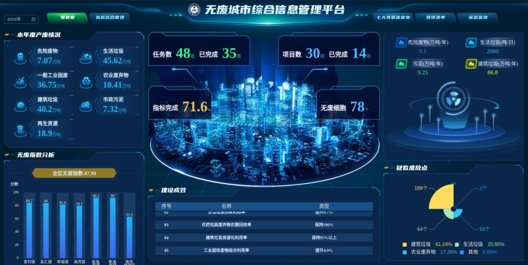 围绕“无废城市”建设,奉贤区在各领域全面发力,成果丰硕。工业聚势,绿能升级。聚焦特色美丽大健康产业精心构筑“无废美妆”联盟,深度激发产业集聚优势,驱动上下游企业协同奋进,践行绿色发展理念,稳步迈向可持续发展新征程;积极引导企业向绿色低碳转型,推动资源利用效率实现质的飞跃,尽显蓬勃绿色发展活力。生活提质,分类践行。垃圾分类体系持续优化,可回收物回收网络不断拓展,资源回收利用率逐步上升,废弃物重回生产循环;建筑垃圾资源化成果突出,绿色、低碳建筑广泛铺开,有效减少建筑废弃物并转化为可用资源。农业转型,城乡融合。紧密结合美丽乡村建设与乡村振兴战略,打造东方桃源等创新农业样板,培育腾达兔业等企业,走出绿色循环发展特色路,促进城乡融合可持续发展。试点引领,智慧管理。“无废细胞”建设全面推进,78个覆盖各行各业的“无废细胞”在奉贤落地生根,绿色理念全面贯穿生产生活各环节,成为区域绿色发展的关键支撑;“无废指数”评估体系精准科学,为建设成效评估提供坚实依据与明确方向,助力建设工作持续优化;“无废城市”综合信息平台整合多项功能,实现对固体废物全生命周期的精细化、精准化监管,为科学决策筑牢数据与技术根基,大幅提升“无废城市”综合管理效能。理念传播,全民共建。通过广泛开展丰富多样的宣传活动,让“无废”走进社区、学校、家庭,使得“无废”理念深入人心,全社会共建共享的强大合力得以凝聚。