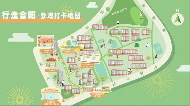 根据合阳小区自治共治项目和阵地建设情况,设计确定接待参观路线,绘制打卡地图,一方面展示现代合阳老小区新活力的治理样本,另一方面方便合阳社区的居民找到活动场所。从而实现人人都能够参与建设合阳,人人都可以享受合阳,人人都愿意介绍合阳,提升社区的向心力和居民的自豪感。