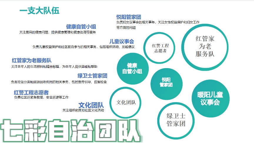 通过梳理整合小区自治团队,确定了以悦阳管家团、绿卫士管家团、健康自管小组和暖阳儿童议事会等为代表的七彩自治团队,这是一支多元化、高效能的自治服务团队,致力于全方位提升居民生活质量、营造社区和谐氛围。