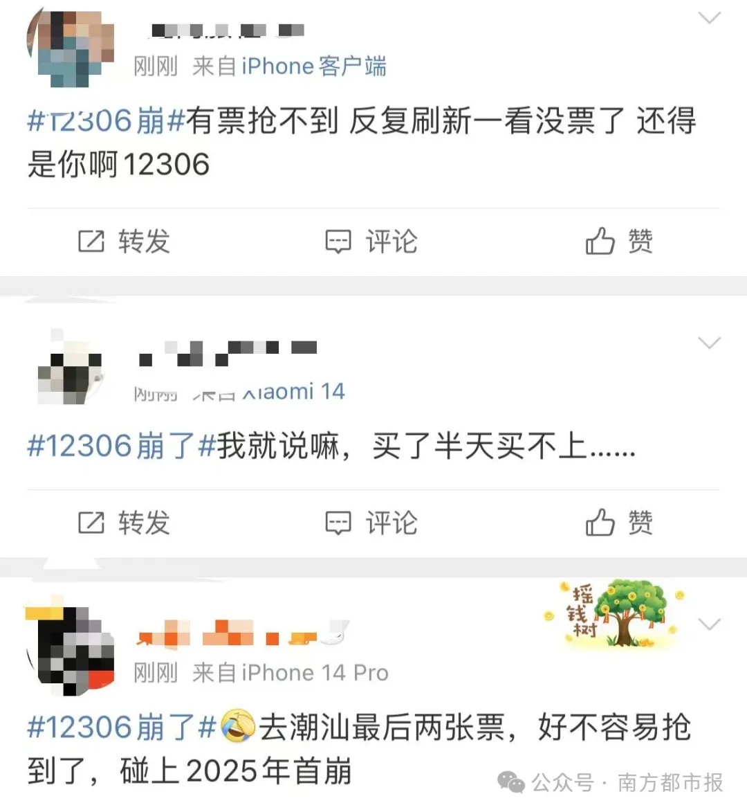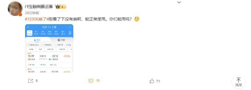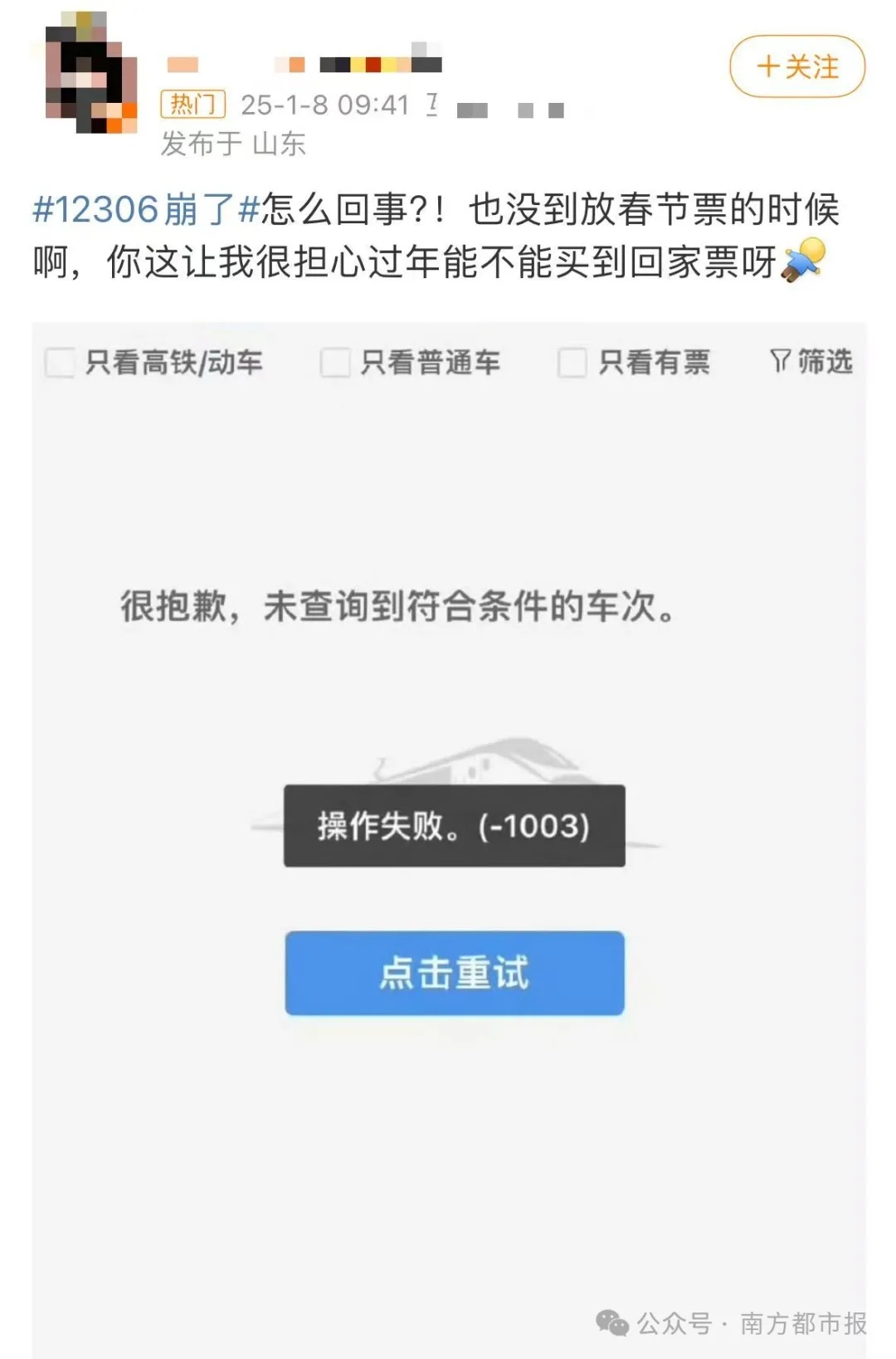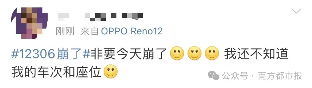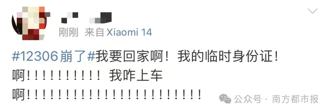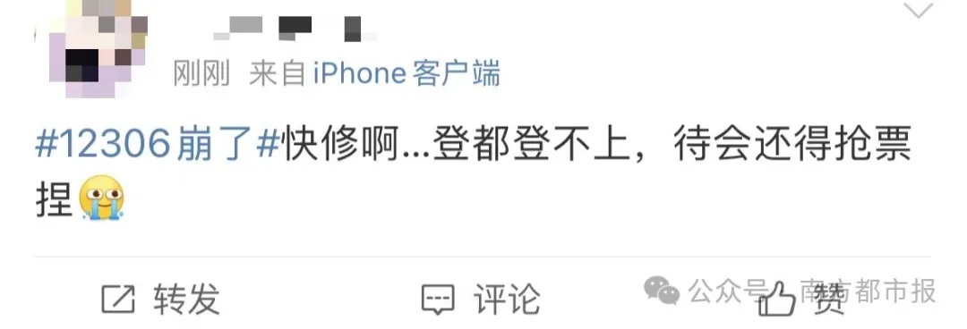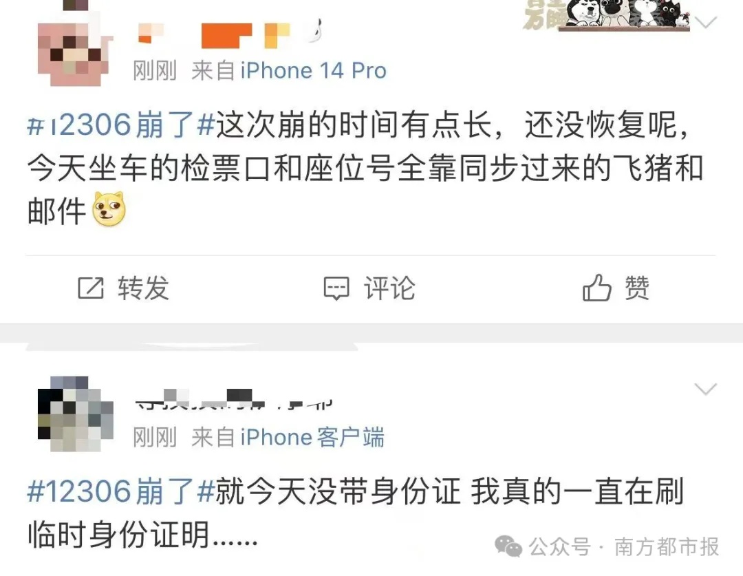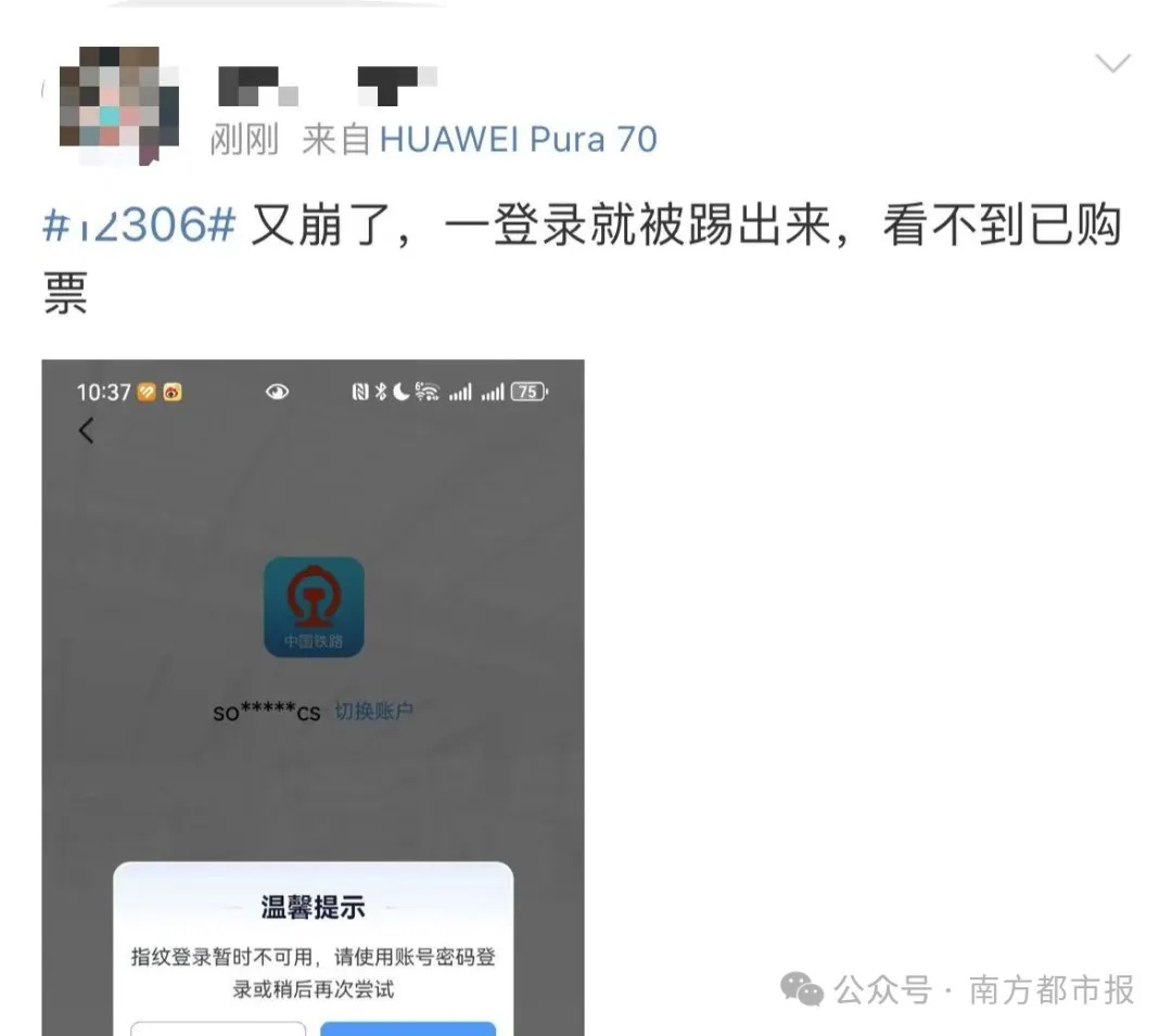 不少用户在微博上表示很着急,“一直登不上去”“买票付不了款,希望快点恢复”“忘带身份证,着急出示临时身份证”“今天坐车还没查到检票口和座位”。