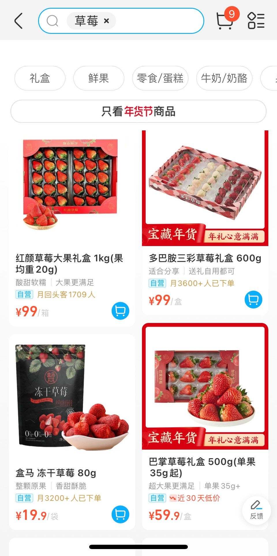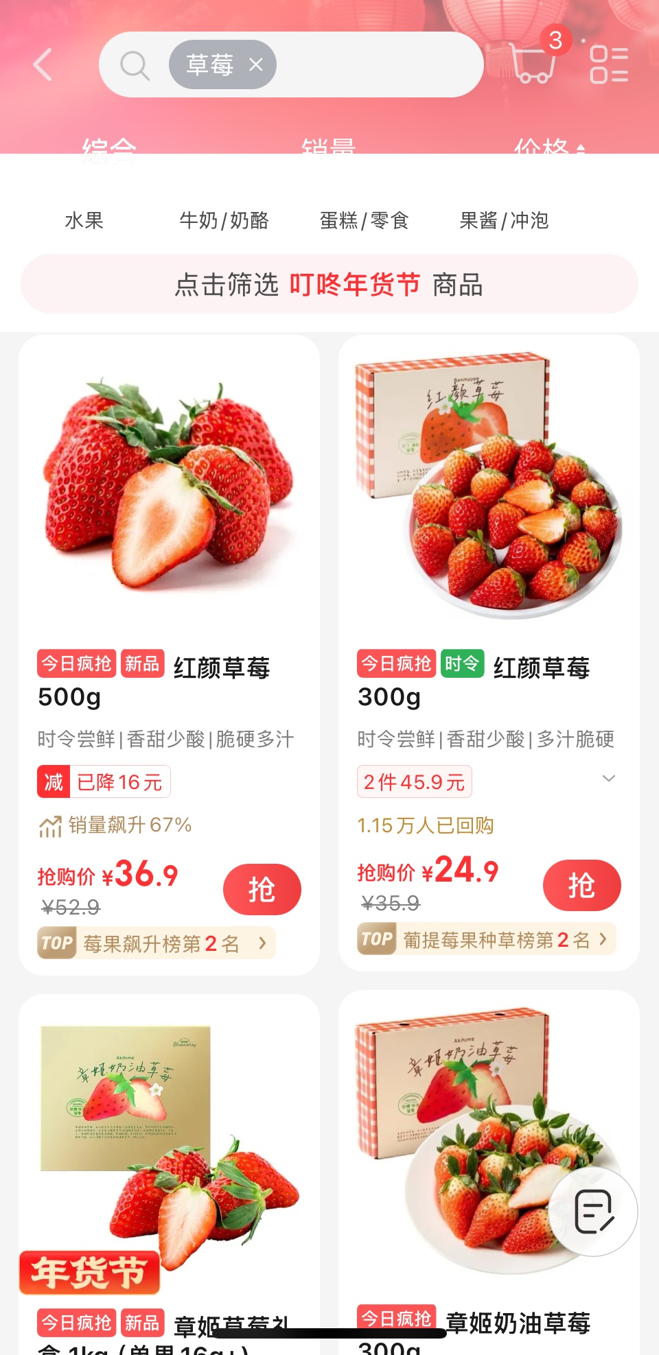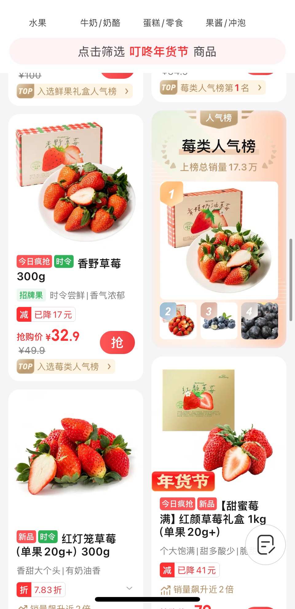 此外,记者在多个生鲜平台上查找发现,各平台都上架了草莓。在品种方面,除了红颜草莓、章姬草莓之外,还有香野草莓和红灯笼草莓等,消费者可以根据自己的喜好进行选择。