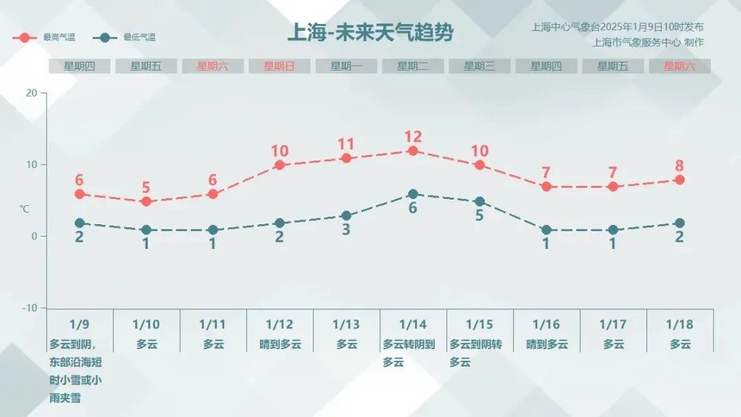 今日天气:“三九”第二天,冷空气正在发力,早晨最低气温零下2℃到2℃之间,最低为崇明零下1.5℃,徐家汇站1.8℃,预计白天最高气温6℃左右。风力较大,中午前后风力进一步增大,北到西北风5级阵风6—7级,沿江沿海地区阵风可达7—8级。风寒效应明显,注意防寒保暖。今天多云天气为主,受冷锋过境影响,今天下午到夜间东部沿海地区或有短时小雪或小雨夹雪,范围小,时间短。相对湿度在90%~40%之间。空气干燥,注意补水。天气趋势:周五、周六白天最高气温跟今天接近,早晨则更冷,市区最低气温可达0℃到1℃,郊区多在零下5℃到零下3℃之间,会出现冰冻或严重冰冻。周日至下周初最高气温回到10℃以上,下一次明显降温出现在下周中后期。未来几天,雨水稀少,多云天气为主。提醒大家天气寒冷、天干物燥,要注意用火、用电、用气安全。