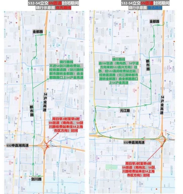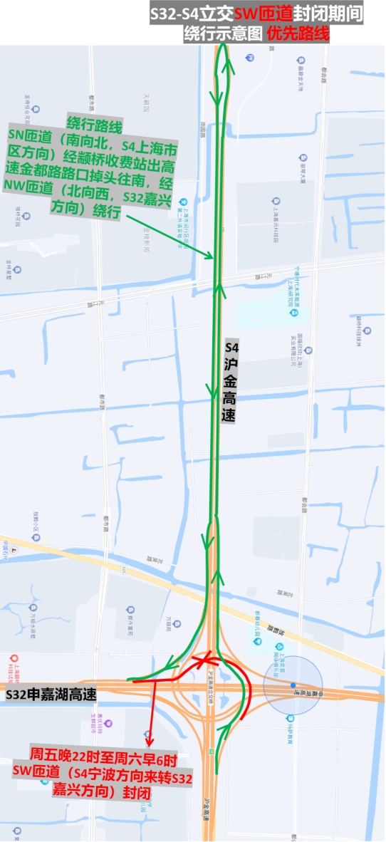 1月12日周日早2时至1月12日周日早6时封闭。途经车辆可提前从地面道路(剑川路-都市路-金都路)绕行至金都路路口上S4沪金高速(上海市区方向),或由SW匝道(南向西,S4宁波方向来转S32嘉兴方向)往西,经S32嘉闵收费站出高速,经地面道路(元江路-都市路-金都路)绕行至金都路路口上S4沪金高速(上海市区方向)。