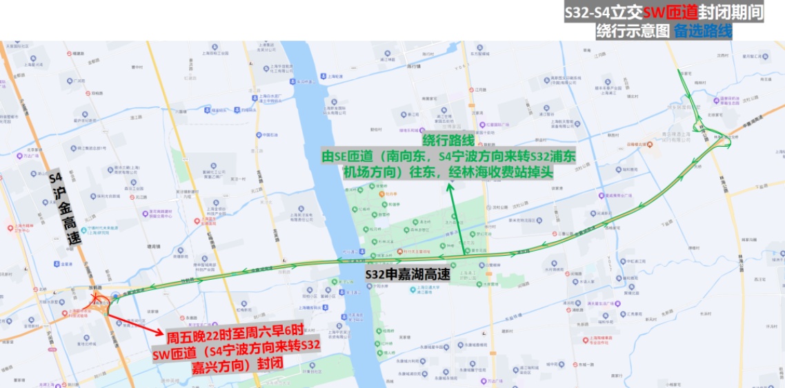1月10日周五晚22时至1月11日周六早6时封闭。途经车辆由SN匝道(南向北,S4上海市区方向)经颛桥收费站出高速由金都路路口掉头上高速,经NW匝道(北向西,S4上海市区方向来转S32嘉兴方向)绕行,或经SE匝道(南向东,S4宁波方向来转S32浦东机场方向)往东,经林海收费站掉头上高速往西。