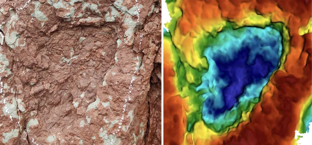 恐龙研究专家、中国地质大学(北京)副教授邢立达介绍,昌都所在的侏罗纪地层最大厚度超4800米,产出了大量恐龙足迹化石。2023年7月,中国地质调查局相关人员在此开展化石遗迹调查时,意外发现疑似爬行动物脚印的岩石石壁,后与中国地质大学(北京)展开合作。