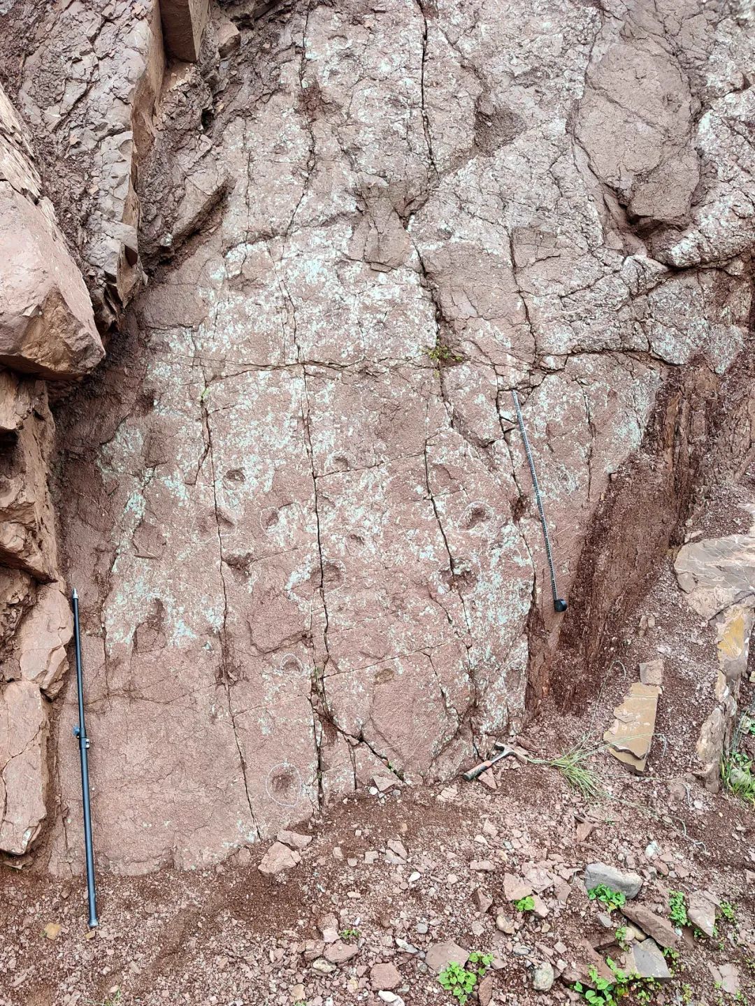 考察队在冻多村发现了两个足迹点。其中一处遗迹化石是尺寸较小、孤立的蜥脚类恐龙足迹,大小从8.8厘米到15.5厘米不等,可能由6只以上恐龙留下。