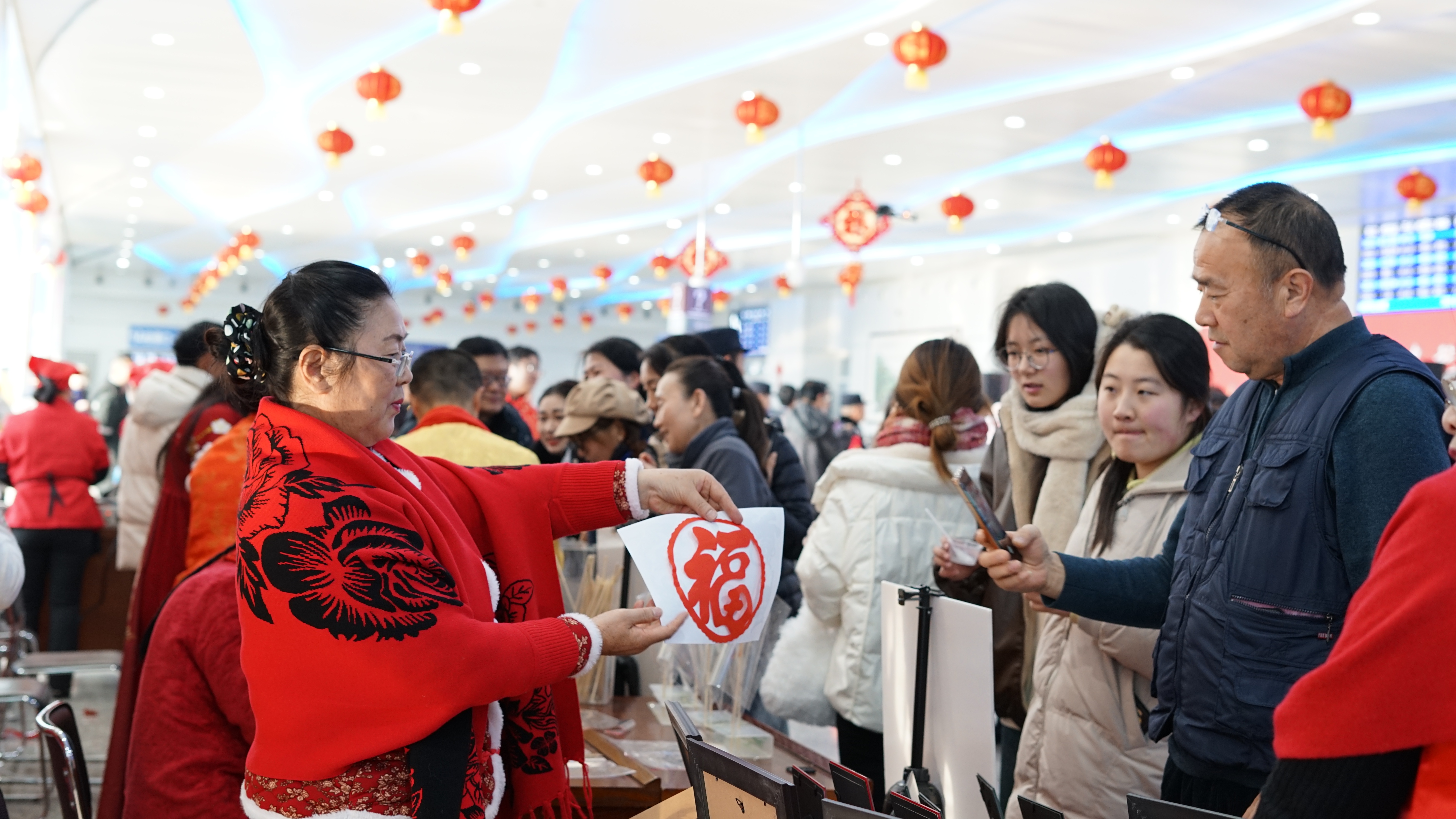 从安检口、候车室、检票口到站台,每一个环节演绎着春运的序曲。在熙熙攘攘的连云港站一楼大厅,除了归家的旅客们,还来了一群特别的人——10余位连云港市非遗传承人,他们齐聚一堂纷纷亮出自己的绝活。精致的剪纸窗花、活灵活现的面塑、俏皮的糖化、喜庆的春联……在春运首日,非遗传承人们与旅客共赴了一场“非遗年味”春运之旅。