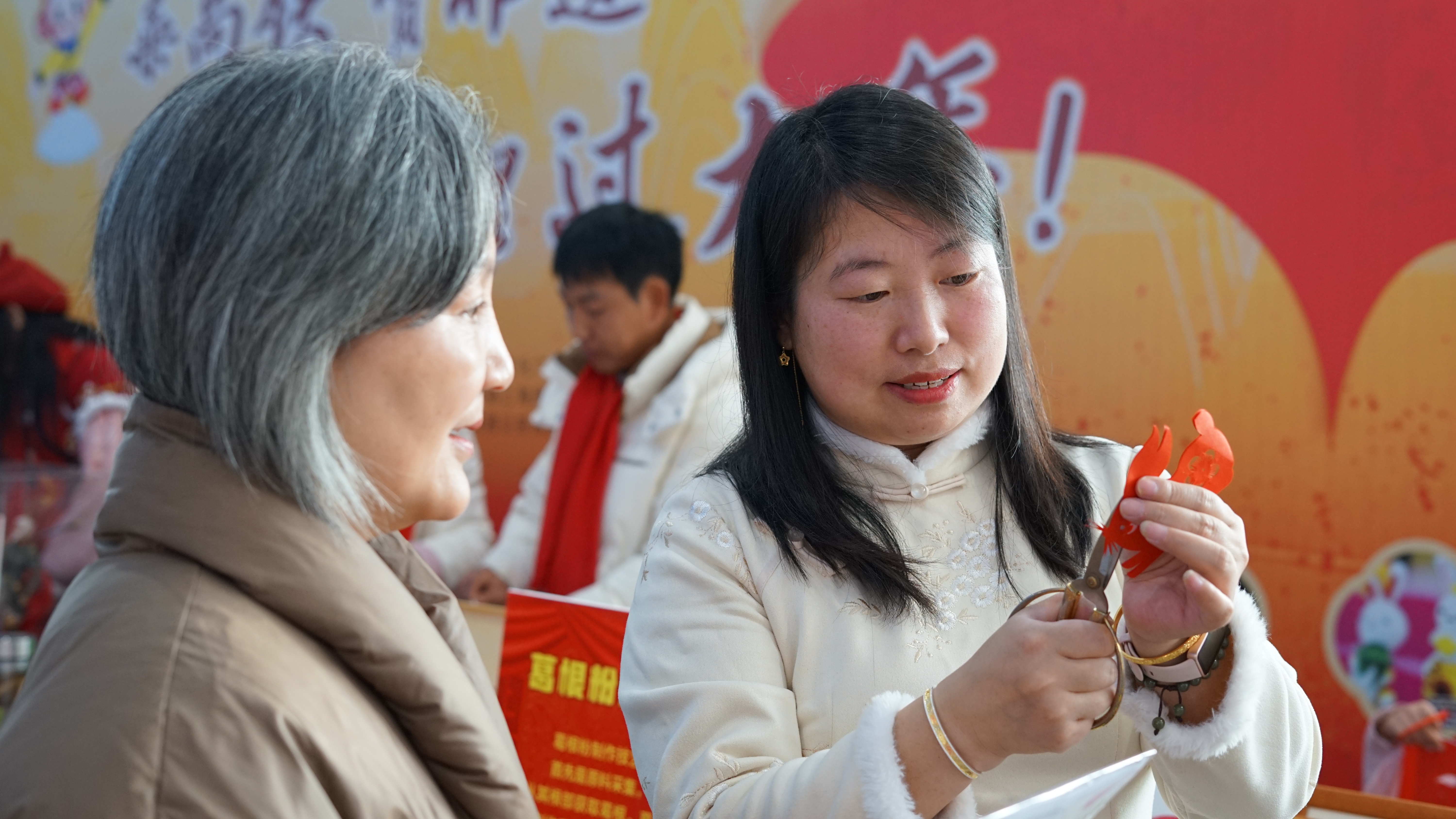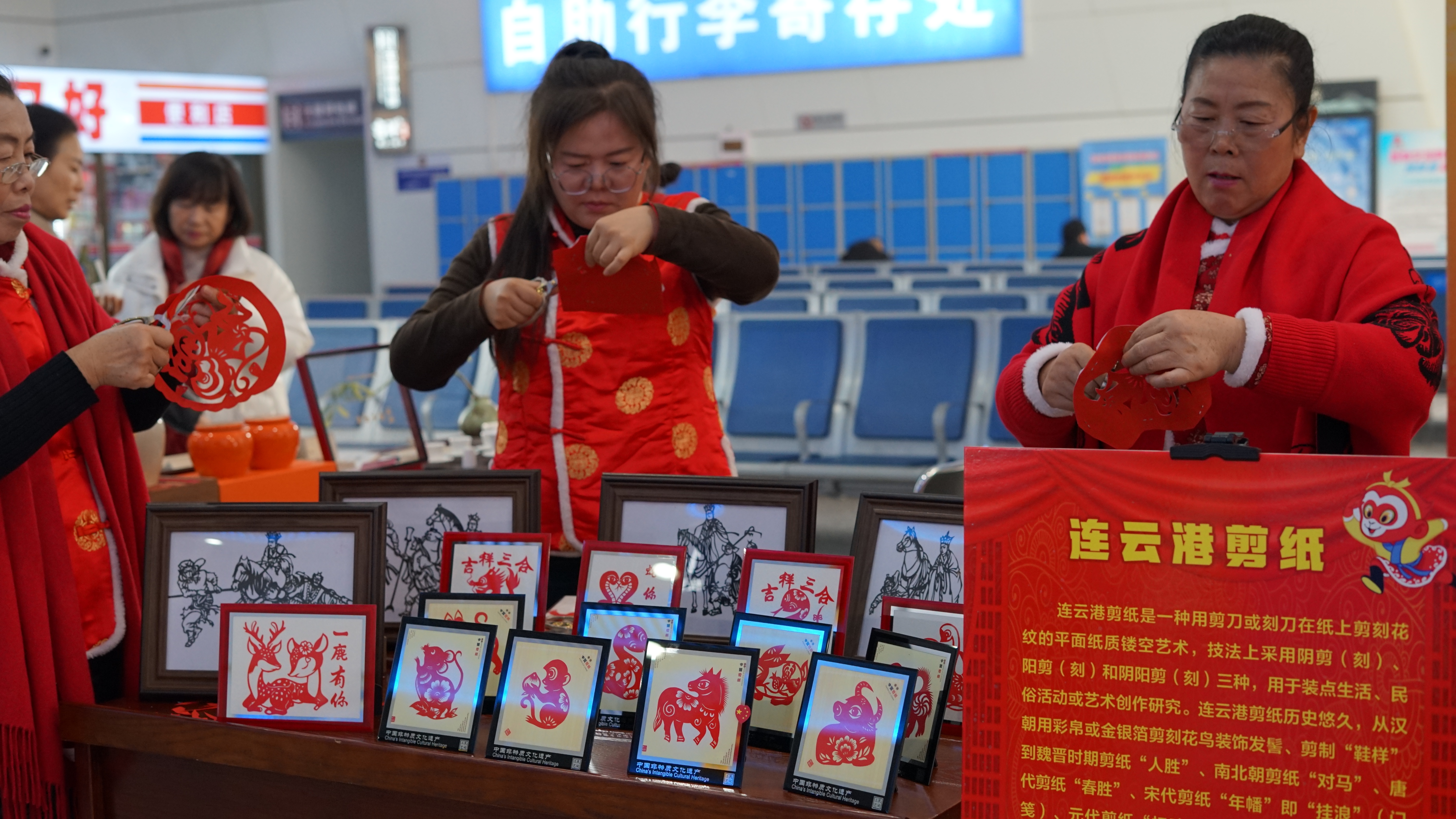 在面塑展位,只见传承人将彩色的面团塑造成孙悟空、五大宫调戏曲家等各类栩栩如生的形象。而几位剪纸传承人的手中,红纸上下翻飞,不一会儿,一张“大圣送福”的剪纸作品变跃然纸上。连云港非遗剪纸传承人管艳说:“今天真是非常高兴,在春运期间将我们非遗技艺带到高铁站,让更多的人了解和喜爱连云港的非物质文化遗产。”
